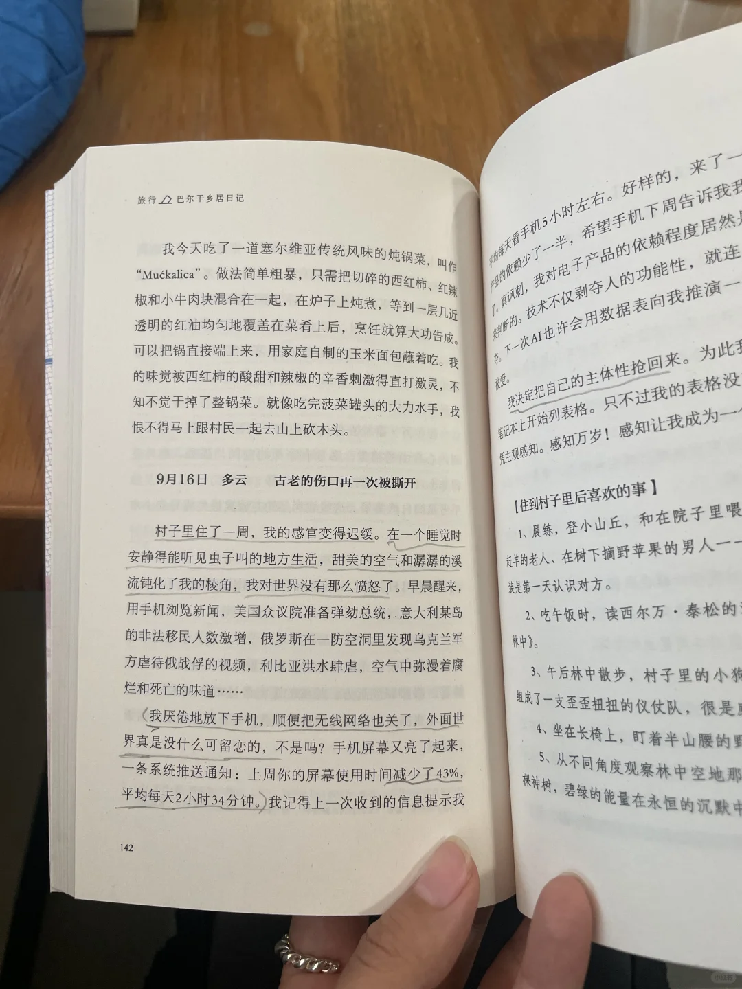 “村子里住了一周,我的感官变得迟缓。在一个睡觉时安静得能听见虫子叫的地方生活,甜美的空气和潺潺的溪流钝化了我的棱角,我对世界没有那么愤怒了。”