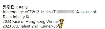 ✨近年冒起由韩国老板投资的娱乐公司ACE娱乐,在香港及韩国两地发掘型男索女,旗下有即将在韩国出道的孖妹组合JJBABY、深受宅男力捧的网红Kylie C. 等。报称是模特儿的郭恩程,去年参加ACE娱乐举行的《Face Of Hong Kong》夺冠,并代表香港到韩国参赛,同时跟ACE娱乐签了多年合约。但她今次为了晋身入围佳丽,在未有清楚申报下,擅自跟无线签合约,变相是“吃两家茶礼”,毫无合约精神。
