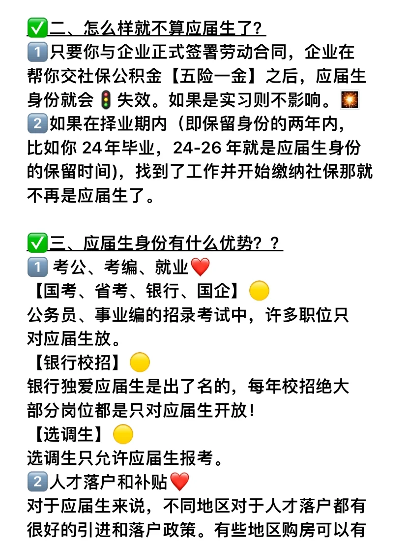 2️⃣如果在择业期内(即保留身份的两年内,比如你 24年毕业,24-26 年就是应届生身份的保留时间),找到了工作并开始缴纳社保那就不再是应届生了。