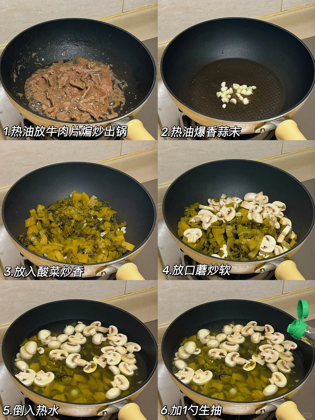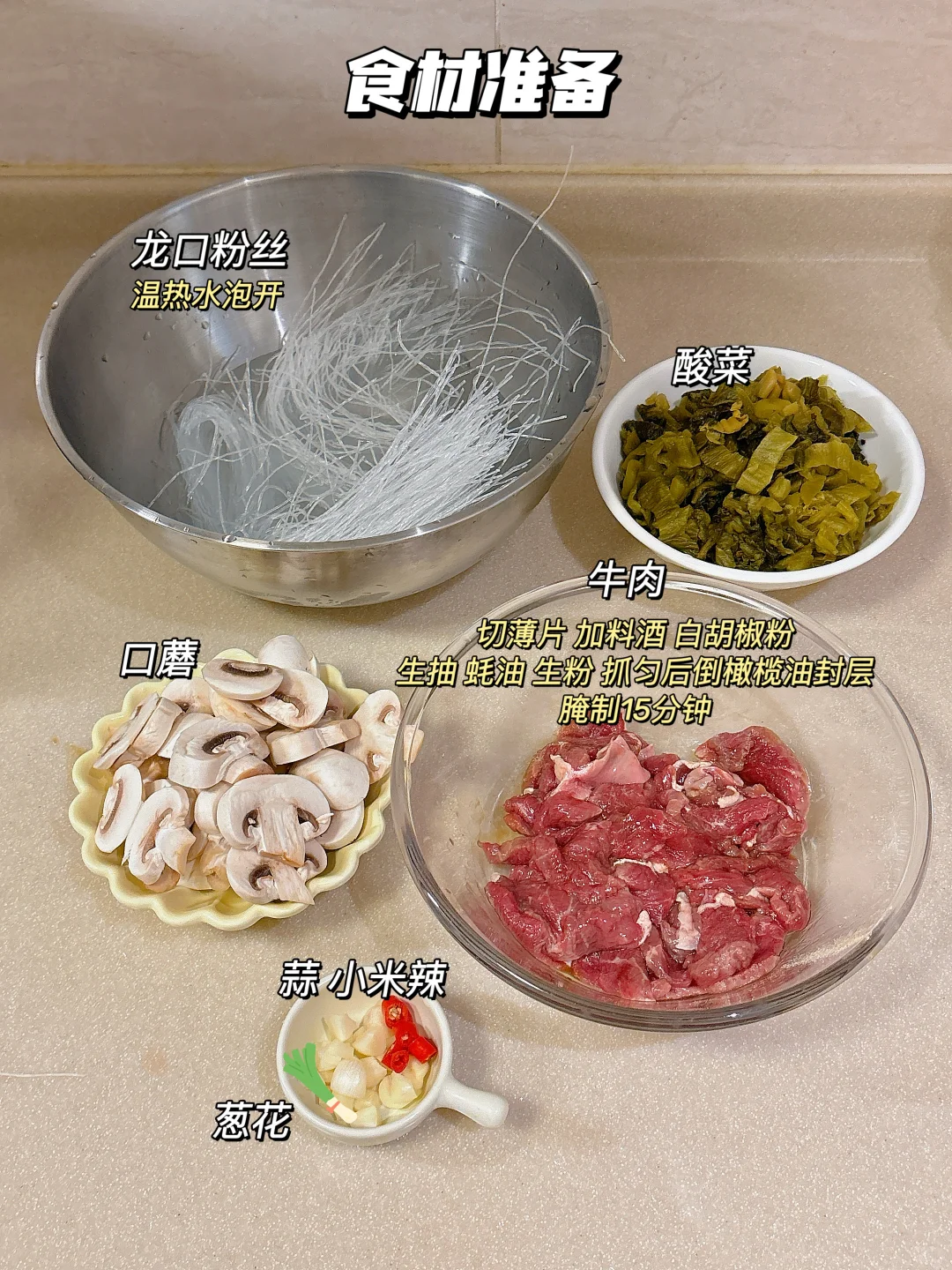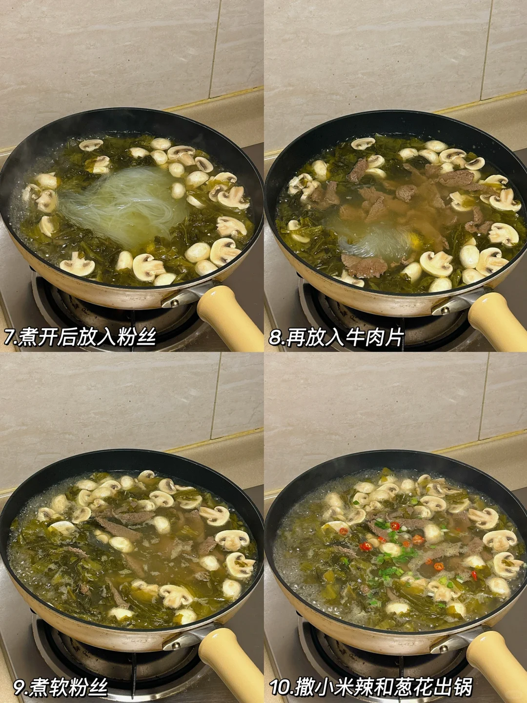 夏天到了容易没食欲,今天分享一道开胃的酸菜牛肉粉丝汤,酸中带点微辣,打开你的味蕾~ . 🐂酸菜牛肉粉丝汤 食材准备:牛肉 粉丝 口蘑 酸菜 蒜 小米辣 葱花 [一R]牛肉切薄片,加料酒,白胡椒粉,生抽,蚝油,生粉抓匀,油封层腌制十五分钟 [二R]龙口粉丝用温水泡开,起锅烧油,牛肉煸炒至熟出锅 [三R]热油爆香蒜末,加入酸菜炒香后下口蘑,炒软加入热水,一勺生抽 [四R]汤煮开后加入粉丝,牛肉片,粉丝煮软后加入小米辣和葱花即可