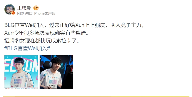 直播吧7月10日讯BLG官宣Wei正式加入队伍,至此BLG形成了双打野阵容,体坛周报记者王玮晨更博锐评:BLG官宣Wei加入,过来正好给Xun上上强度,两人竞争主力。Xun今年很多场次表现确实有些离谱。招牌豹女现在都快玩成索拉卡了。