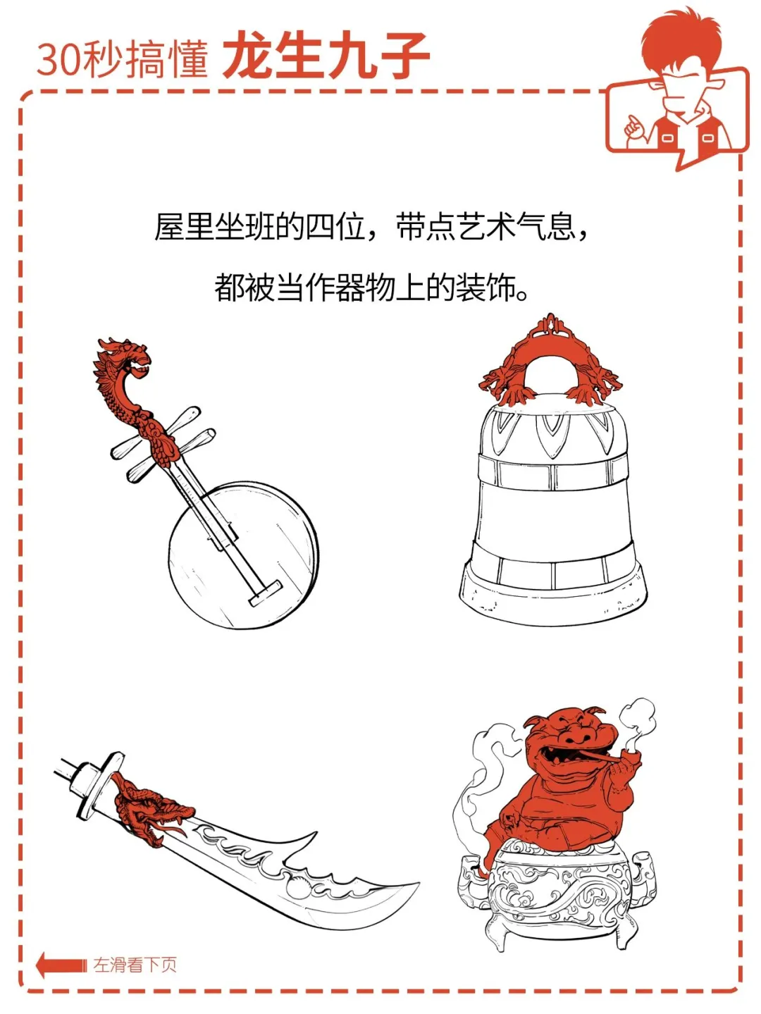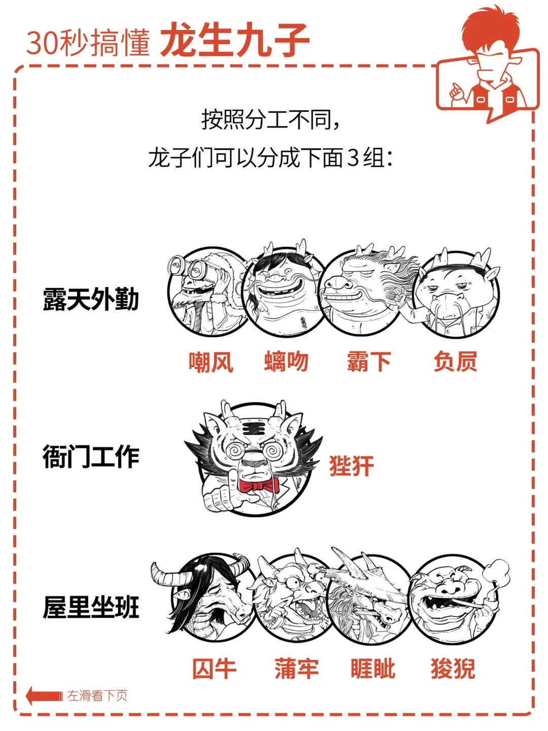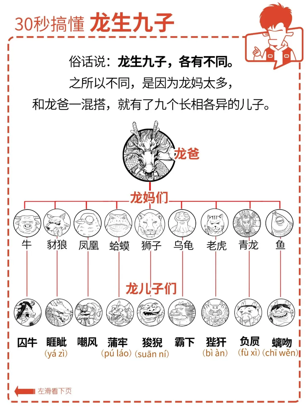 俗话说:龙生九子,各有不同。 九位的名字你可能不熟, 但在生活中,你一定见过它们。 它们有的在房顶上,有的在琴上, 还有的在香炉上…… 它们都是谁?怎么分辨? 各有什么特点? 为什么同一个爹,差别这么大? 今天混子哥就用 30 秒, 帮你搞懂龙生九子。