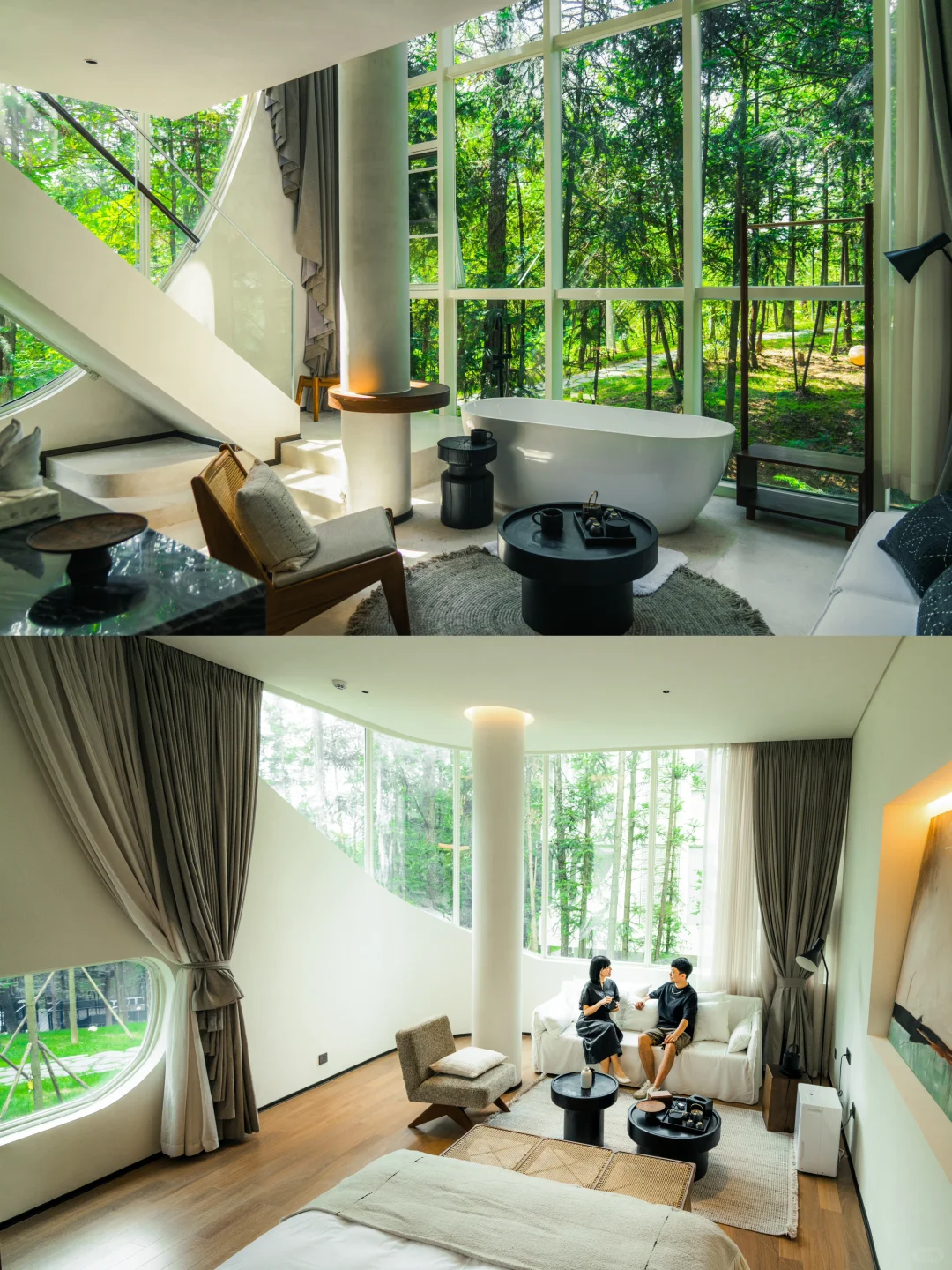 🌳这里房型也非常丰富,独栋木屋、家庭房、270度观景的豪华套房、loft房等等,每间房屋造型不一,景致各异,极具特色,每个房型有很大的落地窗,可以沉浸式看森林景观。