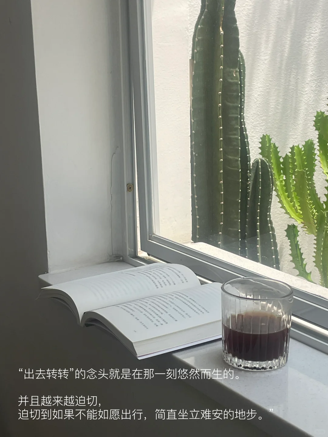 “出去转转”的念头就是在那一刻悠然而生的。并且越来越迫切,迫切到如果不能如愿出行,简直坐立难安的地步。”