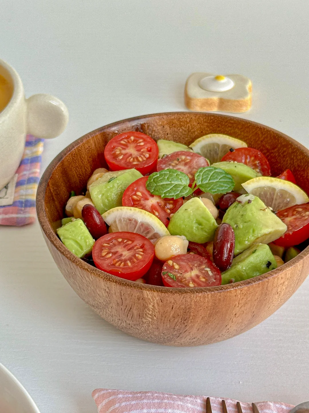 4️⃣牛油果块小番茄,鹰嘴豆和红腰豆混合,加1勺柠檬汁,1勺橄榄油,盐黑胡椒拌匀