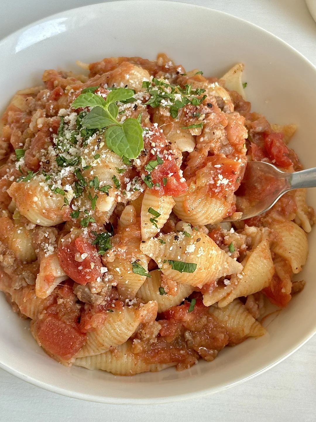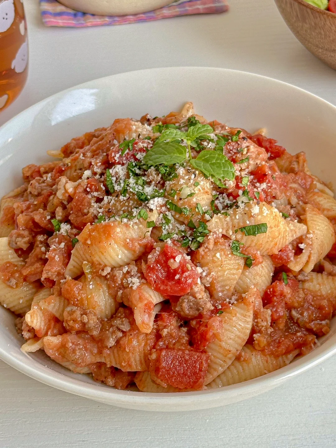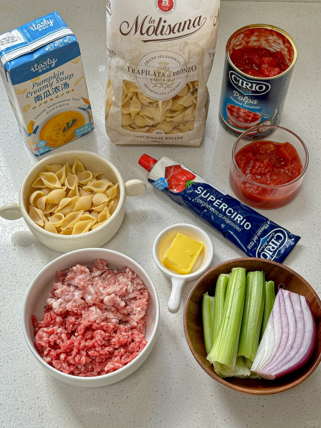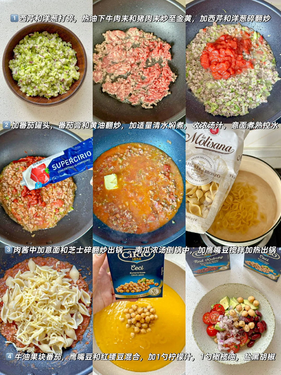 ✅番茄肉酱意面:贝壳意面|猪肉&牛肉糜|西芹|洋葱|芝士碎|番茄膏|番茄罐头