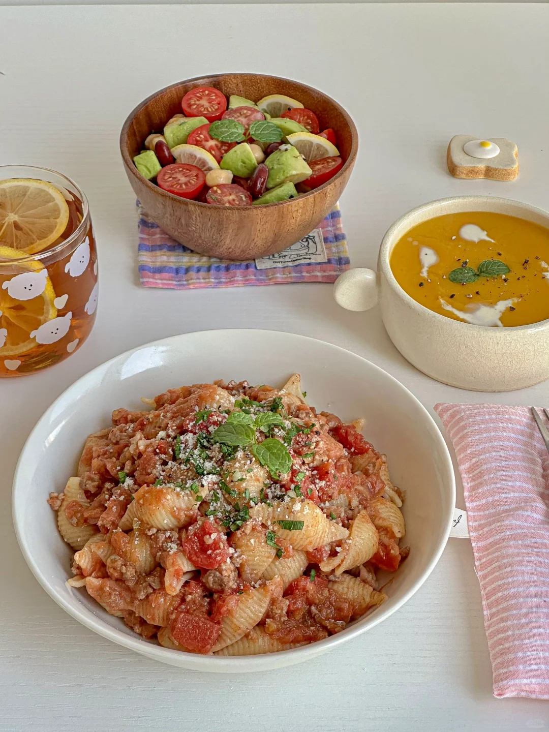 3️⃣肉酱中加意面和芝士碎翻炒出锅 。南瓜浓汤倒锅中,加鹰嘴豆搅拌加热出锅