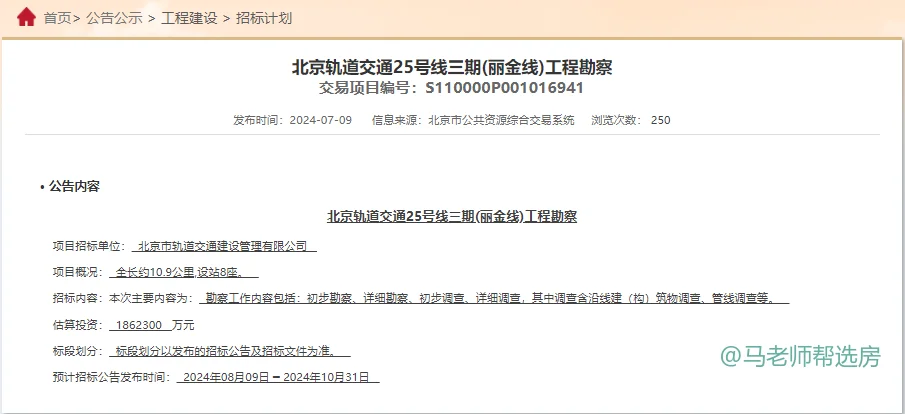 25号线三期丽金线工程,根据招标信息披露,线路全长约10.9公里,设计站点8座。估算投资为186.23亿元。 目前该线路有多个名称,房山线三期北延、25号线、丽金线。推测站位包括:东管头、丽泽商务区、鸭子坊街、广安门、南礼士路、金融街西、金融街、灵境胡同。