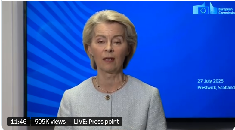 冯德莱恩今晚在欧洲大翻车 川普和乌尔苏拉·冯德莱恩宣布已达成关税协议。 欧盟商品将征收15%的关税,而美国商品则为0%。 欧洲将在美国投资6000亿美元 购买价值7500亿美元的能源 购买价值数千亿美元的美国武器 与此同时,美国将于几周后宣布,将从美国在欧洲的军事基地撤出大量士兵。