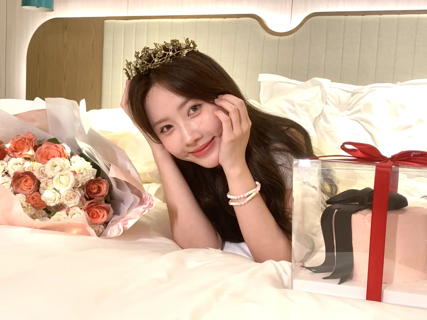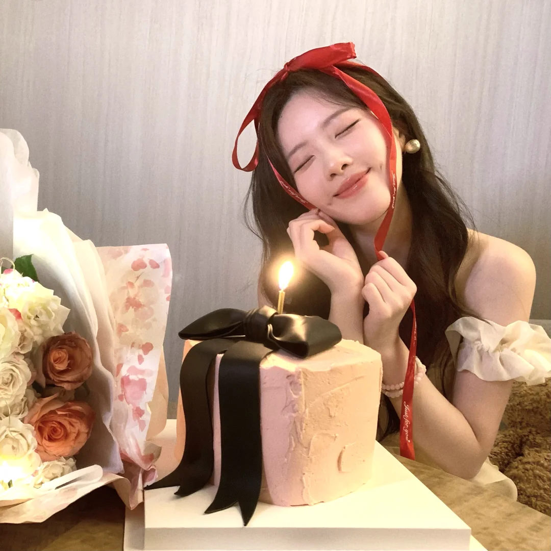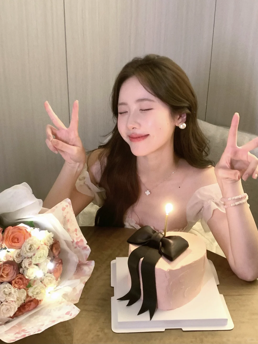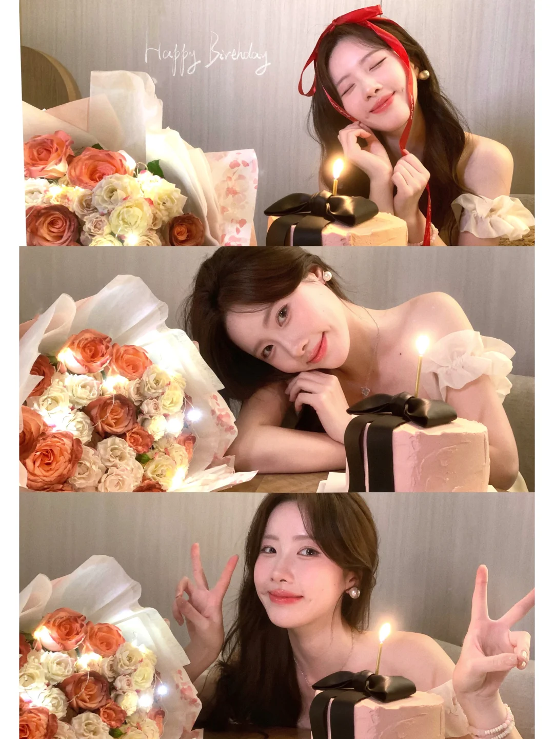 生日拍照姿势🈶️! 可以准备一束花 在被单上和花花互动 蛋糕上的丝带也是不错的道具哦! 照片上xs max拍的~