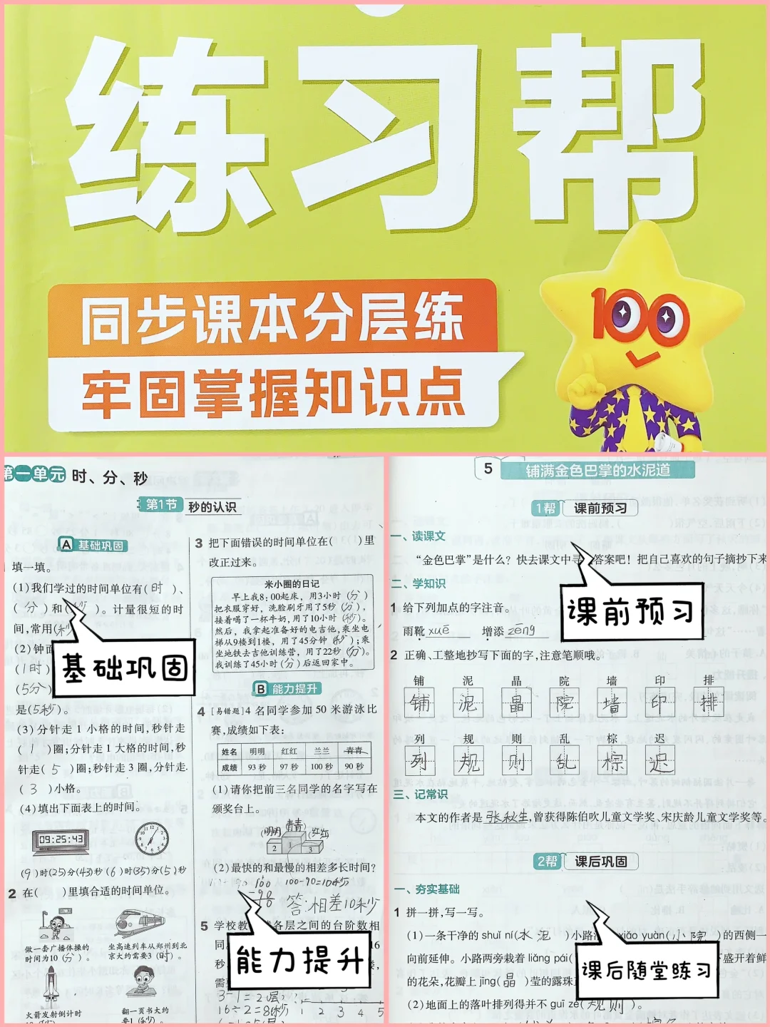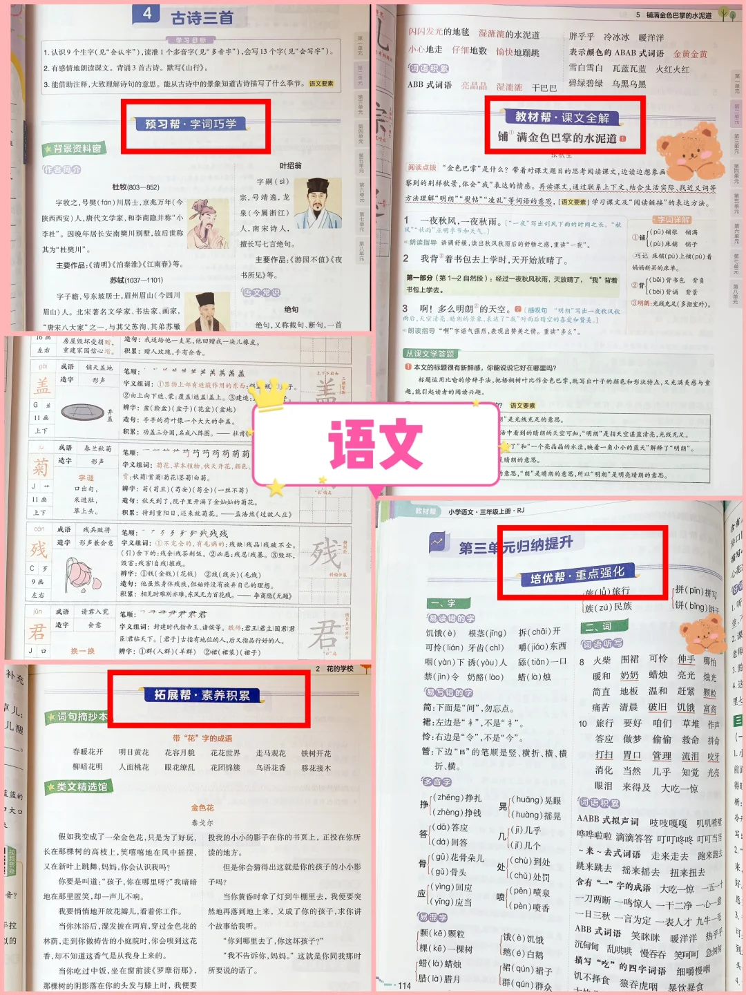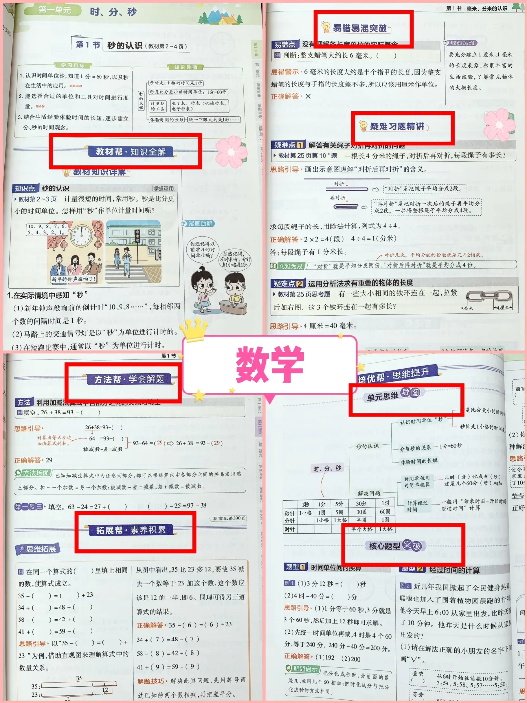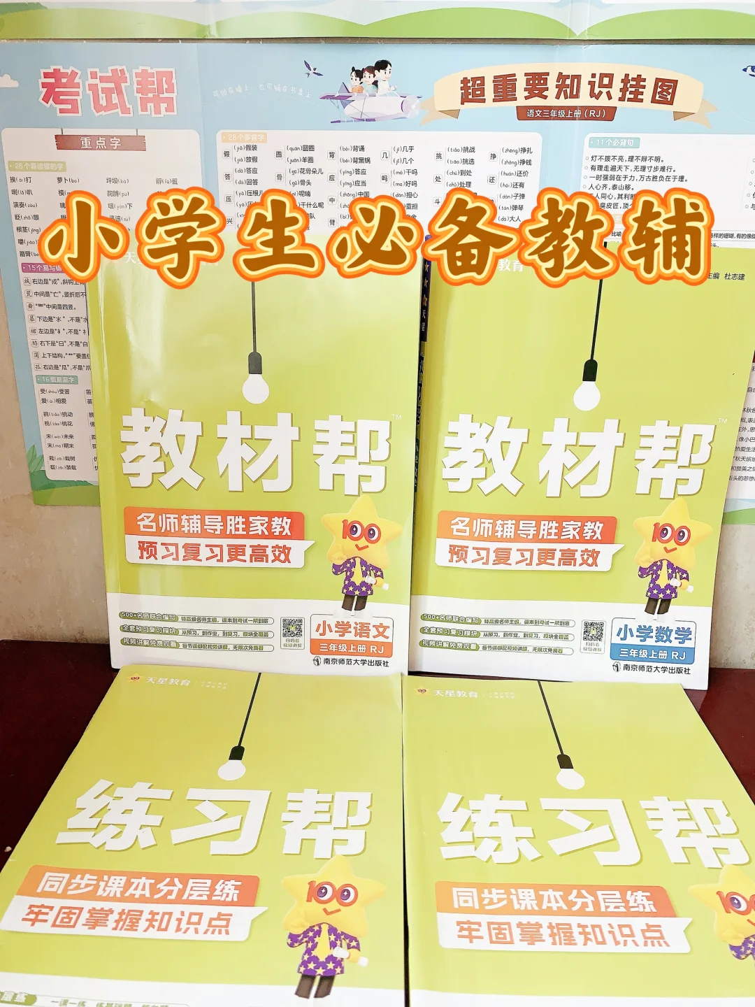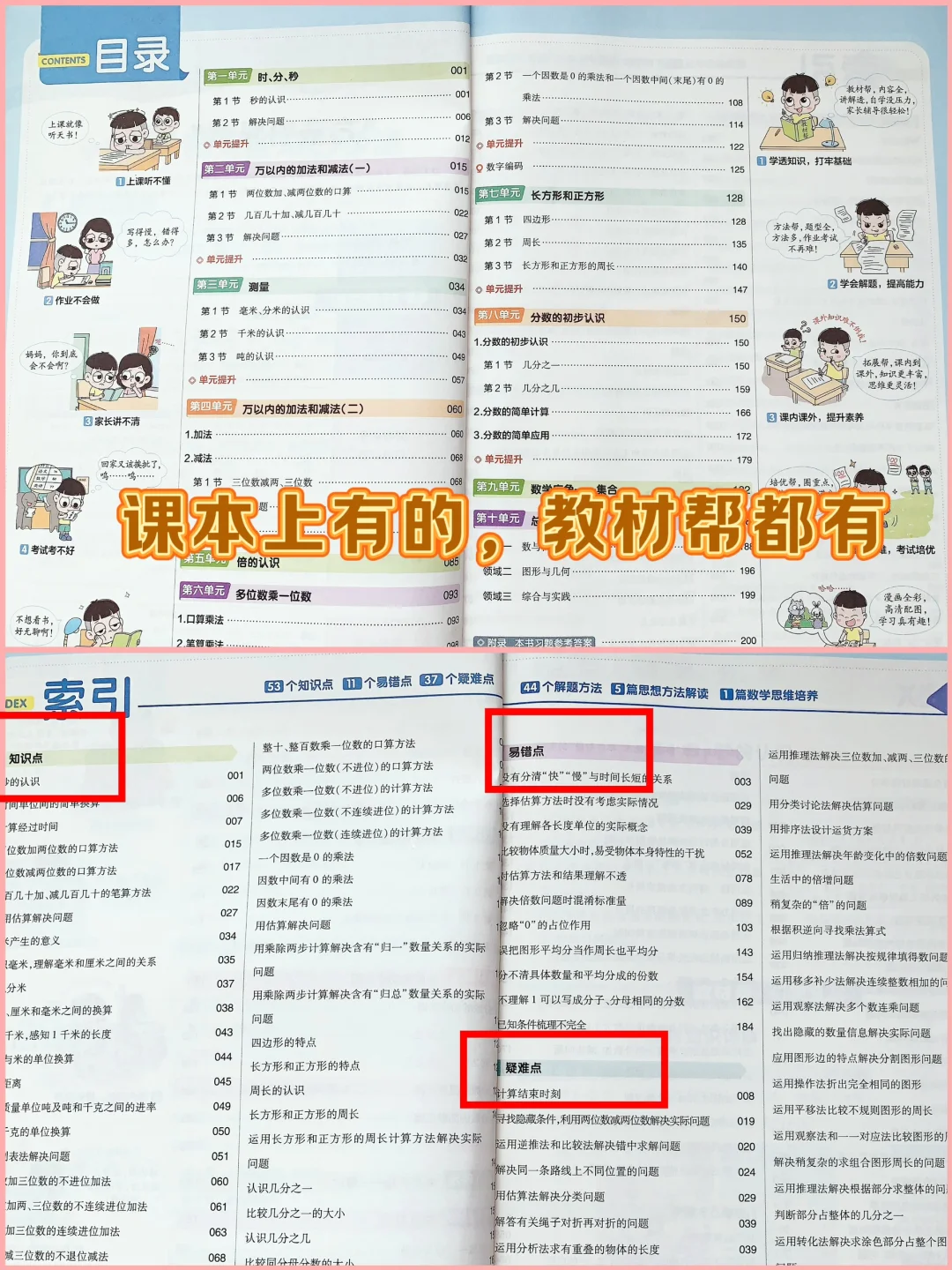 培养孩子好习惯是小学阶段最重要的事。 重点关注30件已整理好,大家可以参考 (见图上☝️☝️☝️) 🌈对于预习和复习的教材,我们已坚持两年使用《教材帮》下面是使用感受 ✅光看目录和索引,就能感受到编者的诚意。 课本上有的,教材帮上都有,没课本也能预习。 “索引”包括本学期易错点、疑难点、解题方法,方便孩子直达目标页。 ✅语文 ①课前预习:全面、清晰、易懂 ……探寻课程背景,作者简介。 ……基础字词解析, 什么结构,查字典音序、偏旁,字义,组词,当让也少不了笔顺。这样学习,嘻嘻可以轻轻松松掌握生字。 ……【词语百花园】包括该课的词语、近义词、反义词、词语搭配、词语积累等 ②课文全解:逐字逐句 ……用不同颜色字体和划线区分重点知识,让孩子对课文了解更透彻,不仅学到了课文字面内容,也拓展了与其相关的内容。嘻嘻在学校掌握不牢的,用这一本就可以把落下的补回来! ③课后巩固:解答完整,复习有的放矢 ……【从课文学答题】是我最满意的环节,教材帮通过结合课文内容进行提问,引发孩子思考和回顾课本知识。解答分为答案和点拨,让语文学起来更轻松。 ……每单元内容学完之后,都会有【归纳提升】,快速帮孩子查缺补漏,巩固提升👍 ④每本教材还附赠了一本练习册【练习帮】,讲练结合,暑假预习、课后巩固、考前复习都能用! ✅数学,方法思路和疑难易错讲解更透彻 ①专栏突破【易错易混点】,归纳点拨,避免再错 ②专栏精讲【疑难点】,捋清思路,学得更透 ③还有漫画助解,让学习更有趣味性🤩 ④知识导图,归纳总结的非常到位,每个章节的知识点都一目了然 ⑤【方法帮】和【拓展帮】,将题型归纳,引导孩子梳理解题思路,培养孩子举一反三、提升思维的能力。 ✅每学科有一张宝藏挂图——【超重要知识挂图】:将整个学期的重点字、词、句、篇,必会的知识要点,必纠的易错易混点和必备的解题方法全面罗列。挂在墙上,孩子每天看到,用来复习,特别实用,十分利于孩子的记忆[赞R] 🌈没有十全十美的教辅,也没有不可取代的教辅,关键还是使用教辅的大家,如何汲取养分发挥它的最大价值,才是关键。