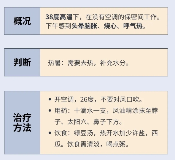热暑:通常在户外过于炎热的环境下劳作、长途行走、停留过久导致,这种情况下人体水分流失过多,人体温度调节会产生失衡,从而导致中暑。 需要快速转移至阴凉处,去热,补充水分。可服用十滴水和仁丹,仁丹具有清暑开窍的功效,可用于伤暑引起的恶心、胸闷、头昏等症状。十滴水具有健胃、和中,可用于中暑。