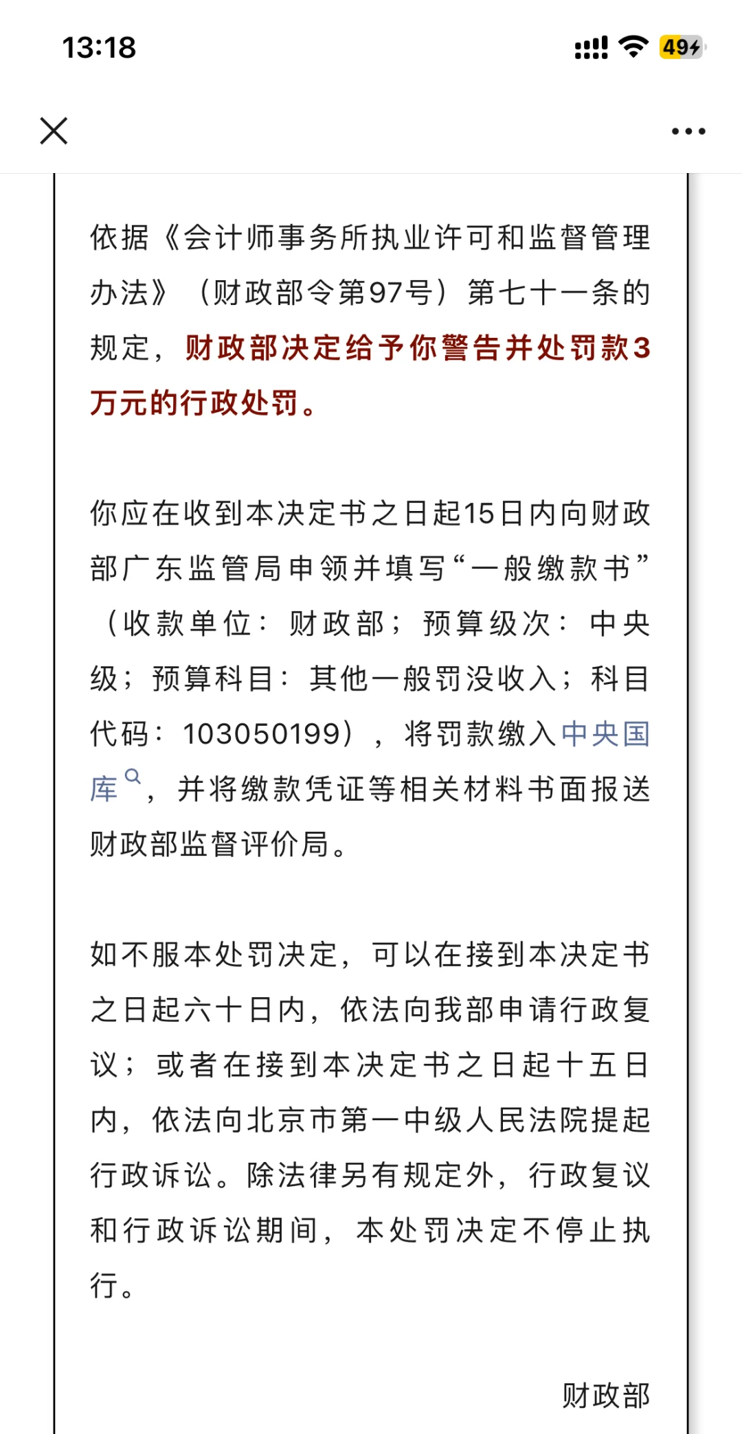 财政部决定给予其警告并处罚款3万元的行政处罚。