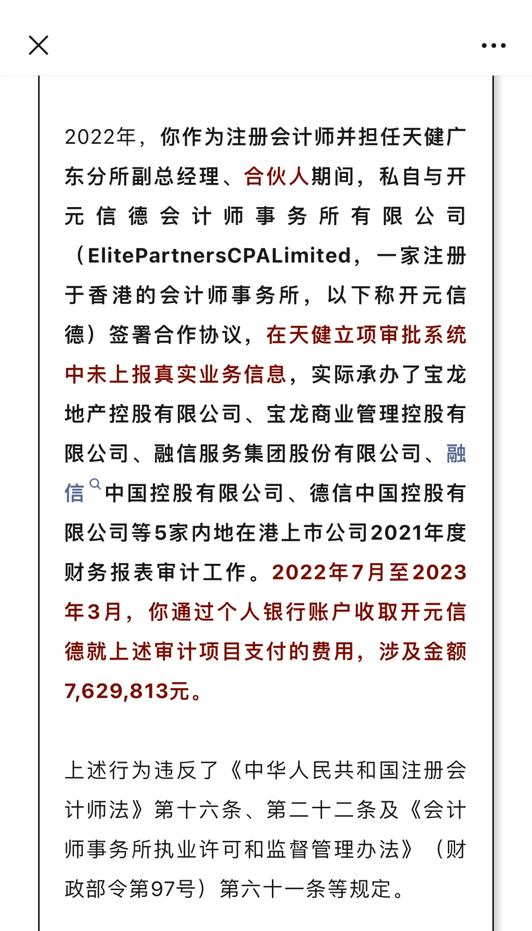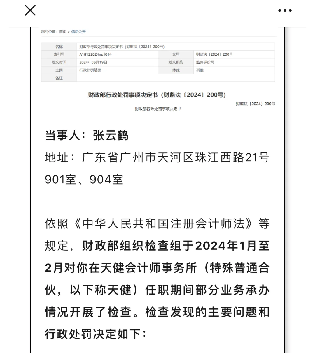 2024年7月11日,财政部公布了对天健广东分所副总经理、合伙人张云鹤的处罚决定。张云鹤作为注册会计师并担任天健广东分所副总经理、合伙人期间,私自与开元信德会计师事务所有限公司签署合作协议,在天健立项审批系统中未上报真实业务信息,实际承办了宝龙地产控股有限公司、宝龙商业管理控股有限公司、融信服务集团股份有限公司、融信中国控股有限公司、德信中国控股有限公司等5家内地在港上市公司2021年度财务报表审计工作。2022年7月至2023年3月,他通过个人银行账户收取开元信德就上述审计项目支付的费用,涉及金额7629813元。