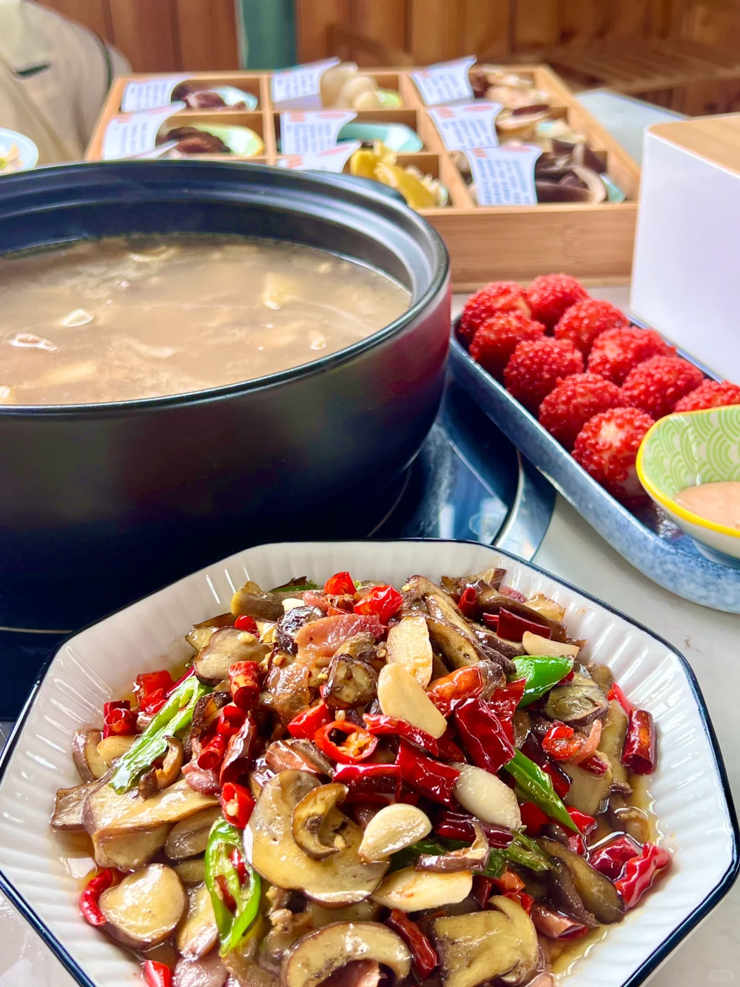 大理 火锅 菌菇火锅 美食 古城人民路附近 一家闹中取静的小店 不仅有花还有菌子火锅 除了鲜香软滑的各式菌子 还有酸甜可口的荔枝虾球 最爱的竟然是金耳菌刺身 又是大饱口福的一天呀