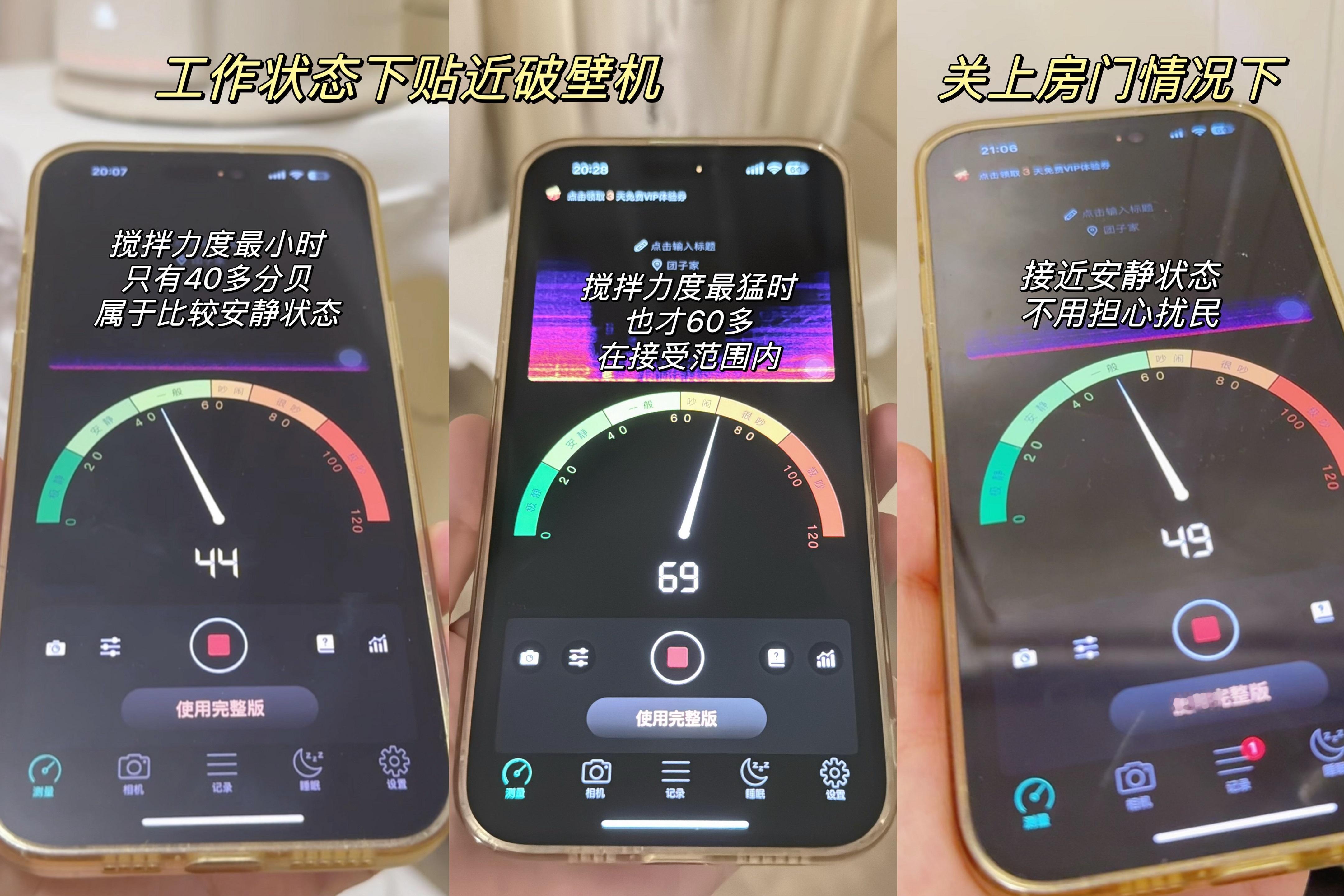 具体静音效果可以看我图里用的分贝仪数字!完全没声音不太可能,但是在高速运转的破壁机来说这个声音完全可以接受,至少不会吓到在旁边玩的饮水机。如果关个门的话声音更小!