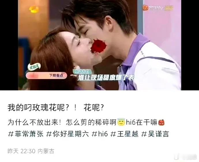 关于《你好星期六》节目中吴谨言与王星越的精彩互动片段——叼玫瑰花与夹乒乓球的温馨场景被意外删减的消息,引发了众多观众的不满与遗憾。
