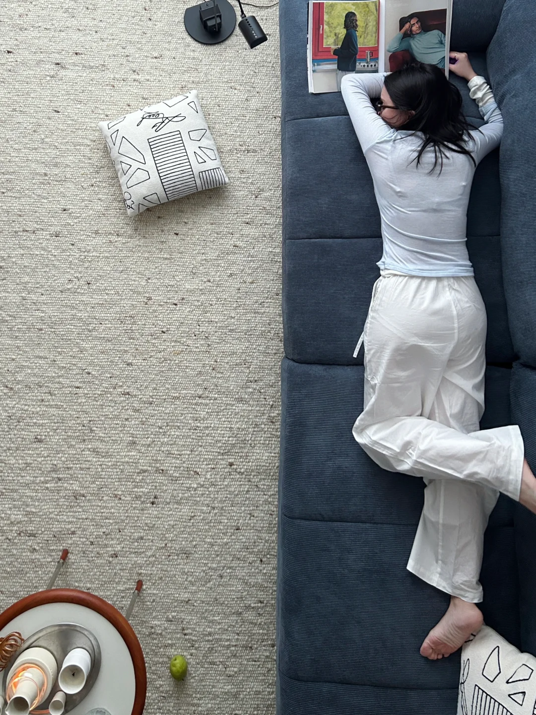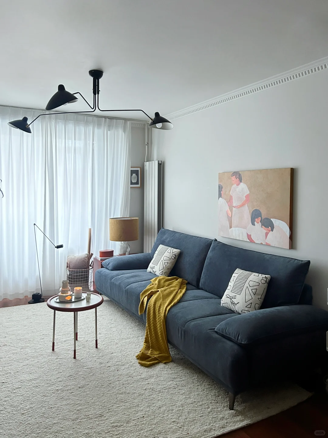 丹宁蓝的沙发、中黄色的装饰画