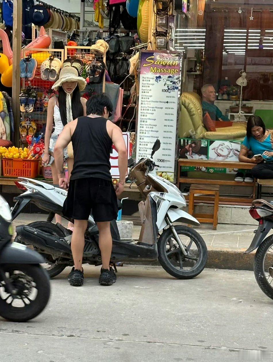 #杨和苏 复合#杨和苏在街头,擦着摩托车的后座,而女伴则在旁边逛街,看起来不亦乐