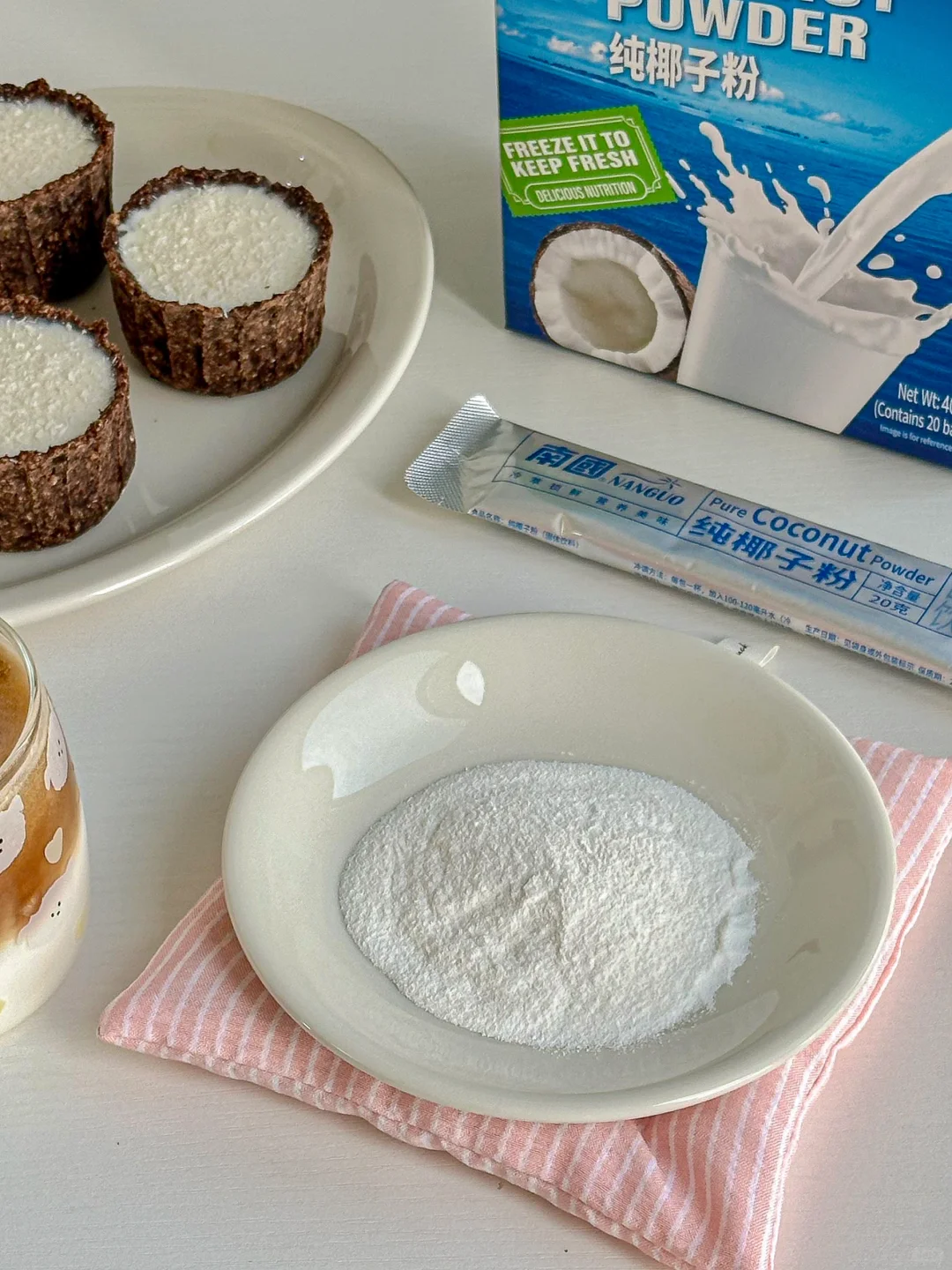 锻炼期间每天都要和教练报备饮食,不敢吃太腻的甜品。所以选择用南国纯椰子粉做的奶冻部分,这款椰子粉产自海南房前屋后的椰子树,老椰肉冷萃锁鲜研磨,很好的保留了最初的营养。 而且是0️⃣白砂糖、0️⃣添加的,喝起来很放心。