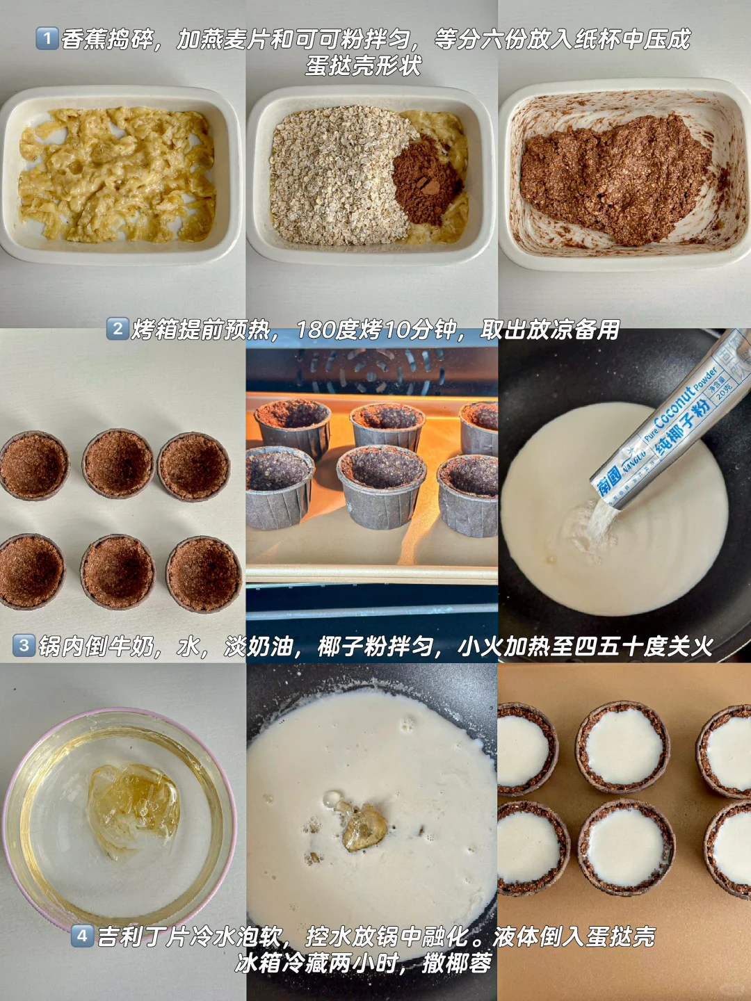 1️⃣香蕉捣碎,加燕麦片和可可粉拌匀,等分六份放入纸杯中压成蛋挞壳形状