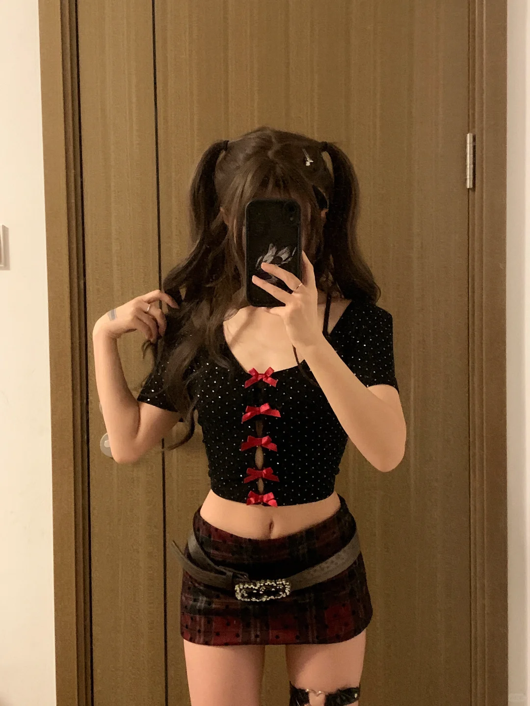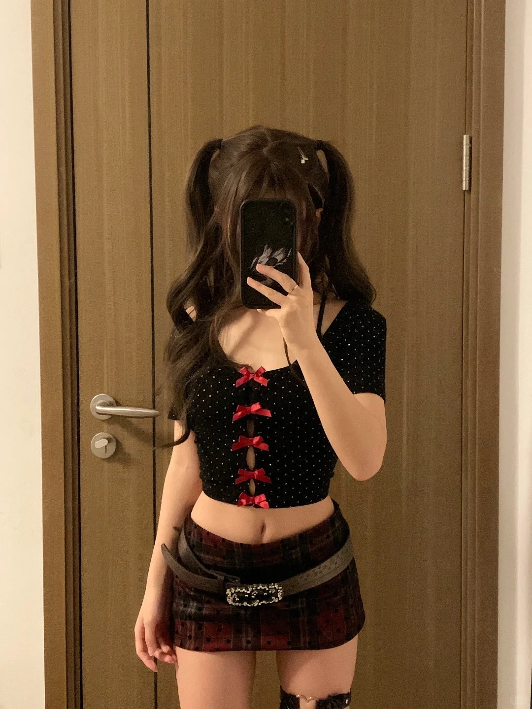 蝴蝶结波点拼接撞色短上衣➕格子低腰裙裤包臀裙 衣服好好看呀 上身就是美式甜心辣妹!!