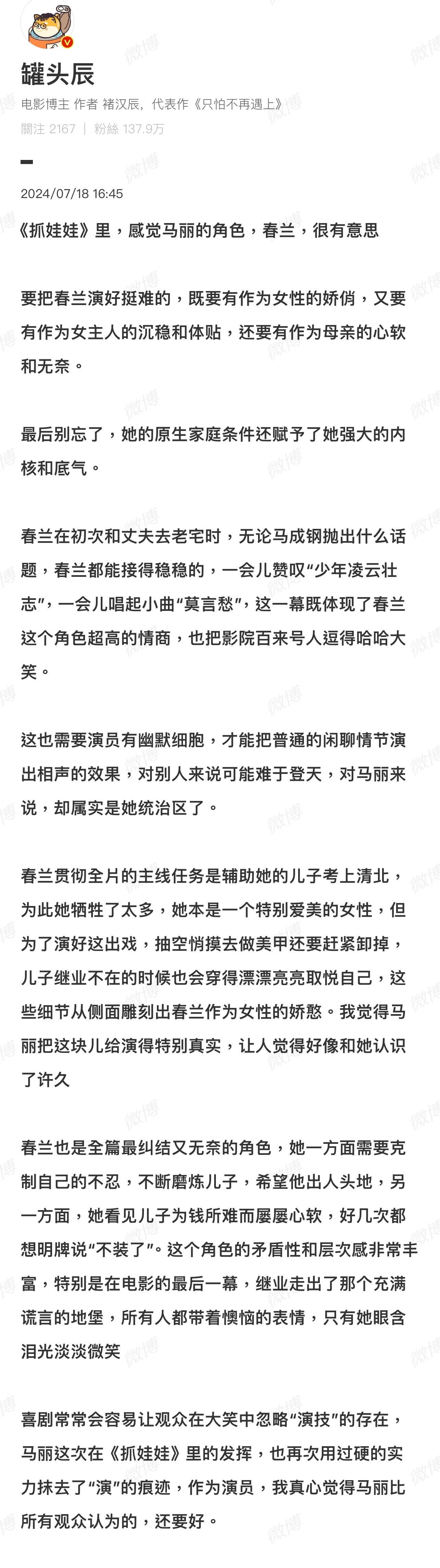 #马丽演的妈有种落地的真实感# 在《抓娃娃》的难受情节中,马丽扮演的春兰让人倍感