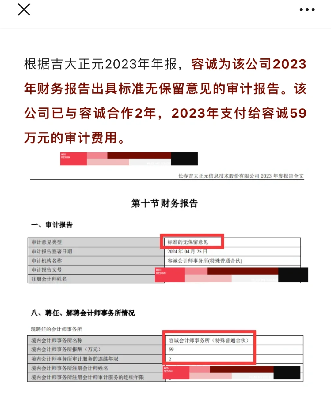 容诚执业的吉大正元2023年年报审计项目被抽中检查。根据吉大正元2023年年报,容诚为该公司2023年财务报告出具标准无保留意见的审计报告。该公司已与容诚合作2年,2023年支付给容诚59万元的审计费用。 来源:上市公司公告、吉林监管局