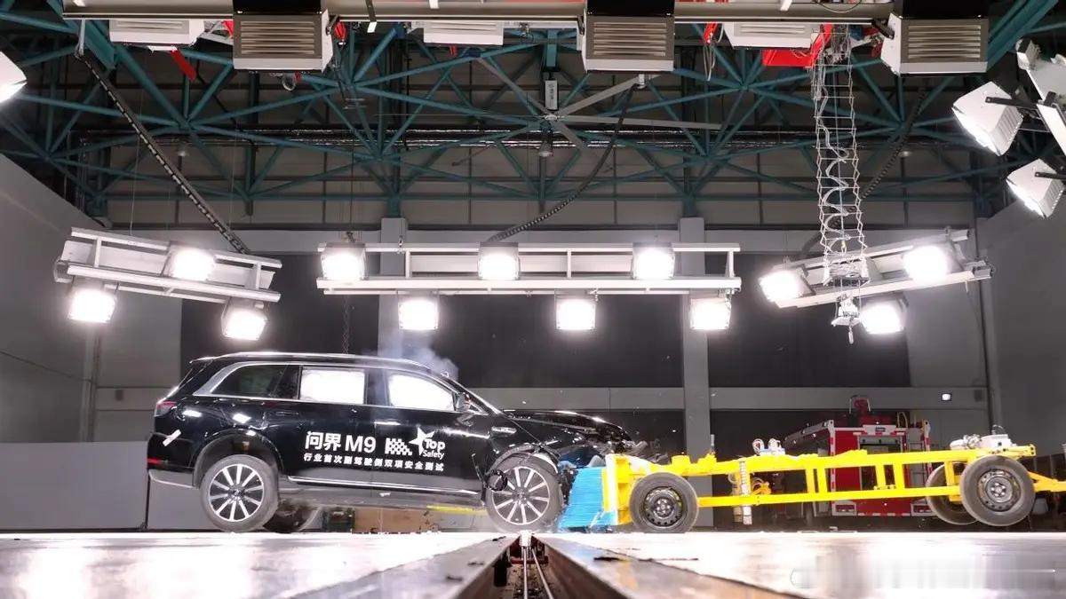 工程师将问界M9车辆按照75°的角度安置于飞行地板上,随后以32km/h的速度使其与钢性柱发生碰撞
