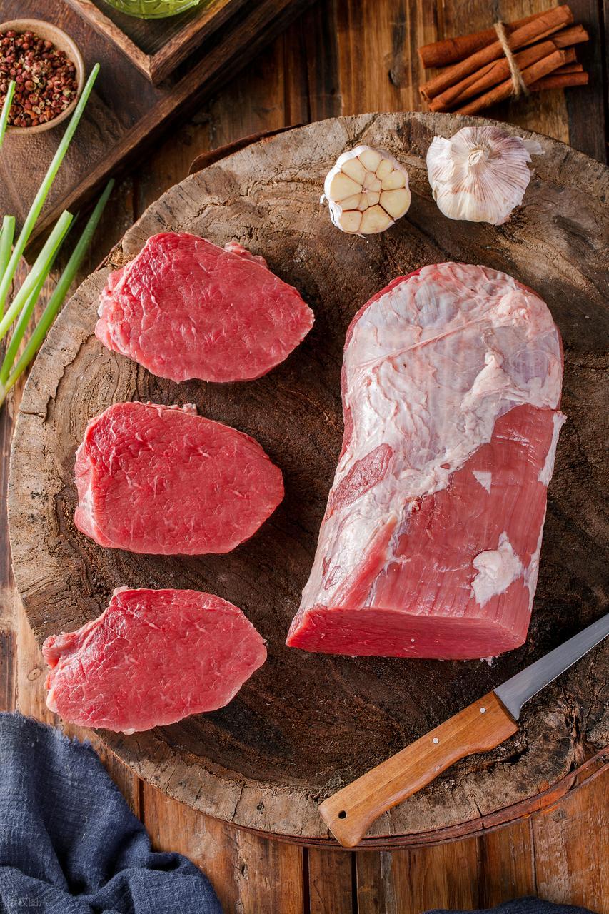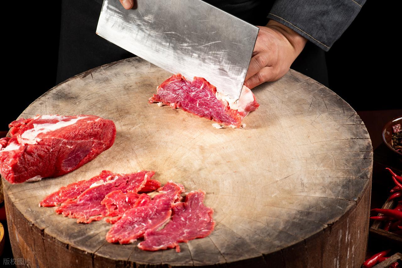 牛肉的纤维组织较粗,结缔组织较多,应横切,将长纤维切断;不能顺着纤维组织切,否则不仅没法入味,还不易咀嚼。比如切牛里脊片时,要看清肌肉纹理,刀与纹理垂直90度角切下,这样切出的肉片口感更嫩。