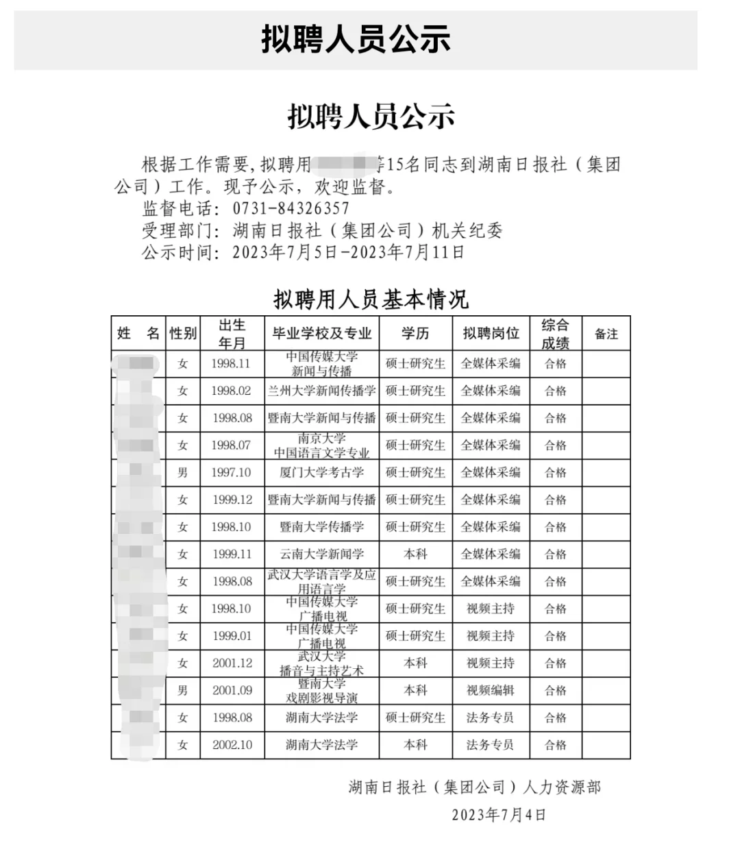 湖南日报社录取名单公示