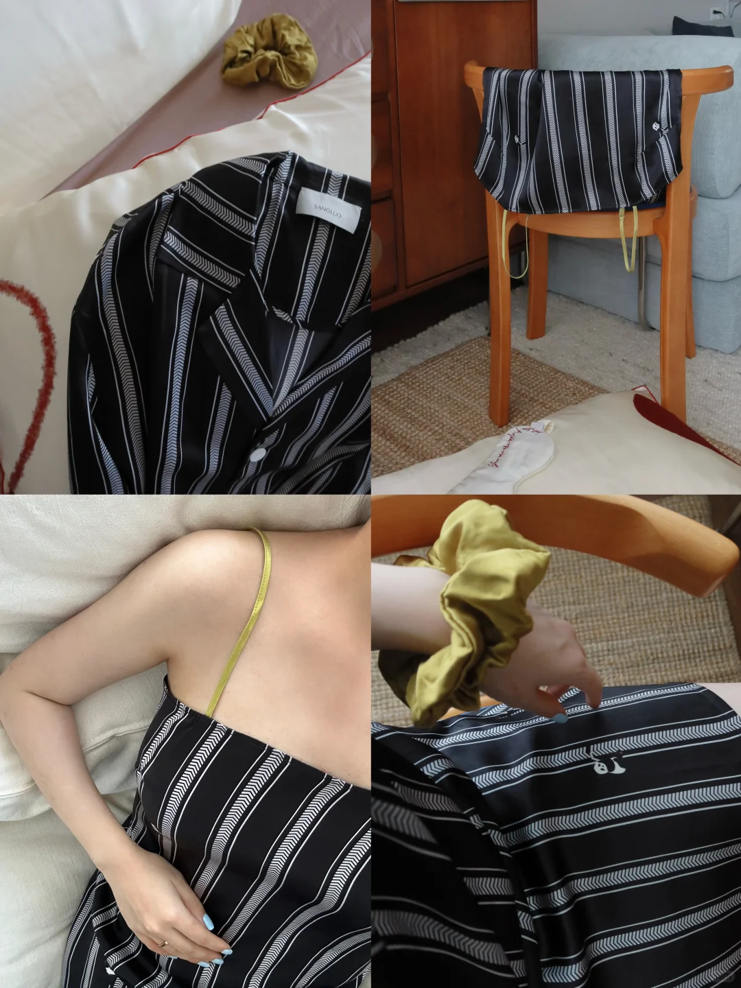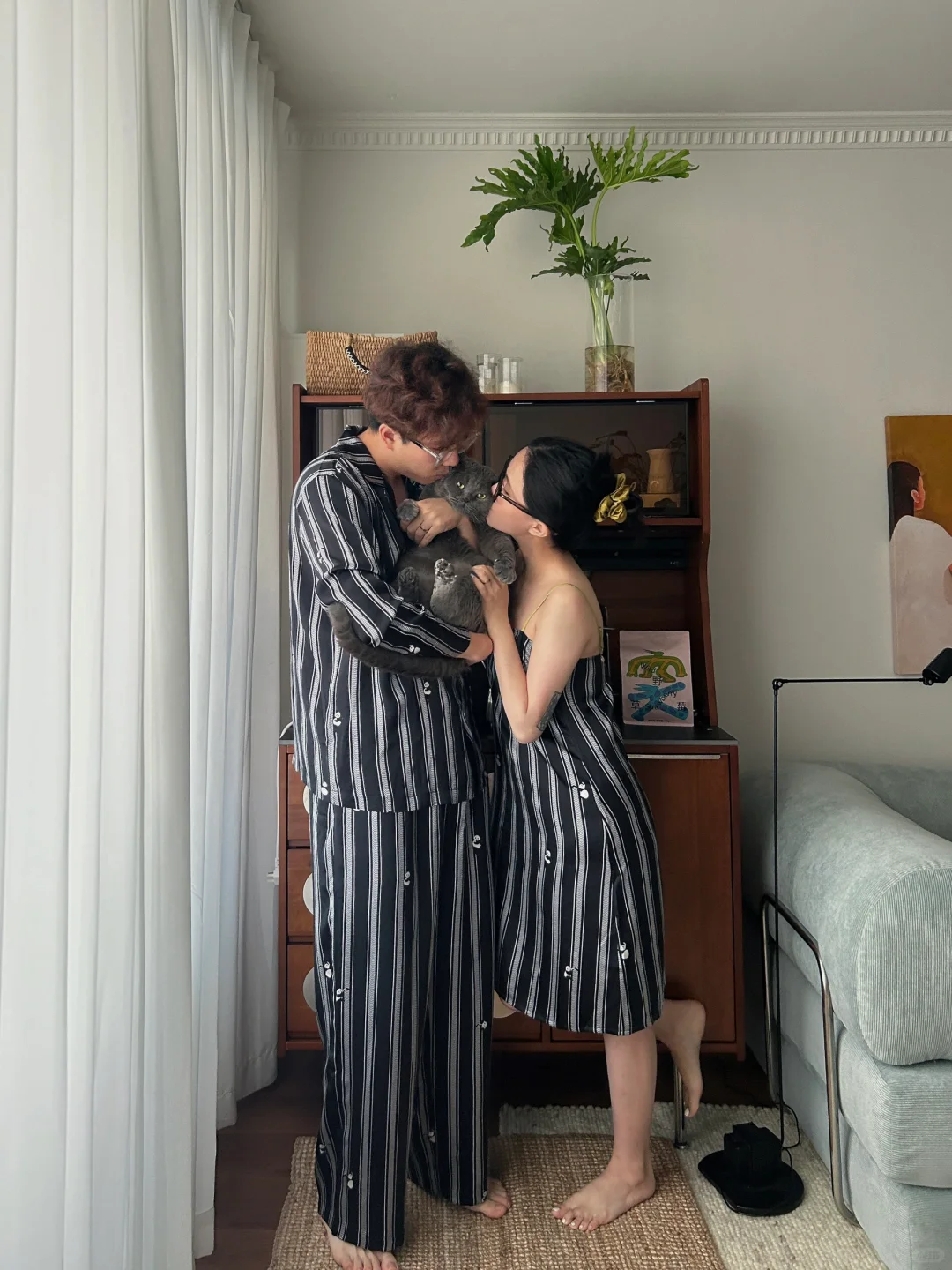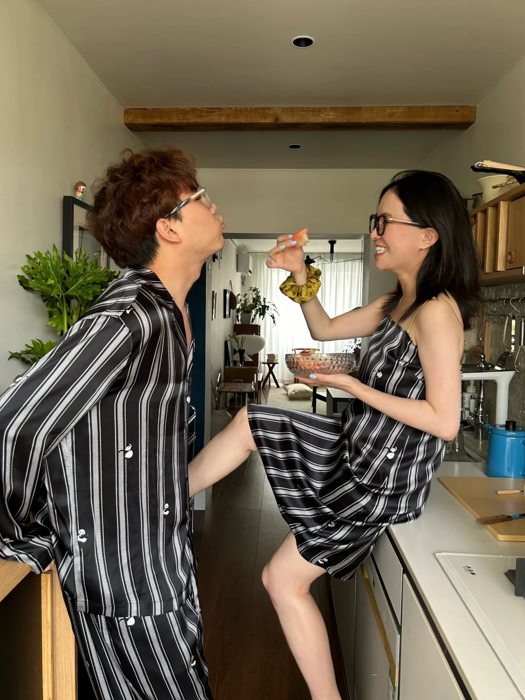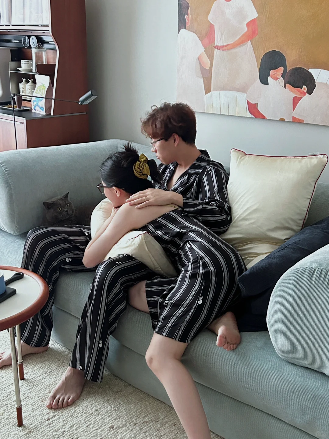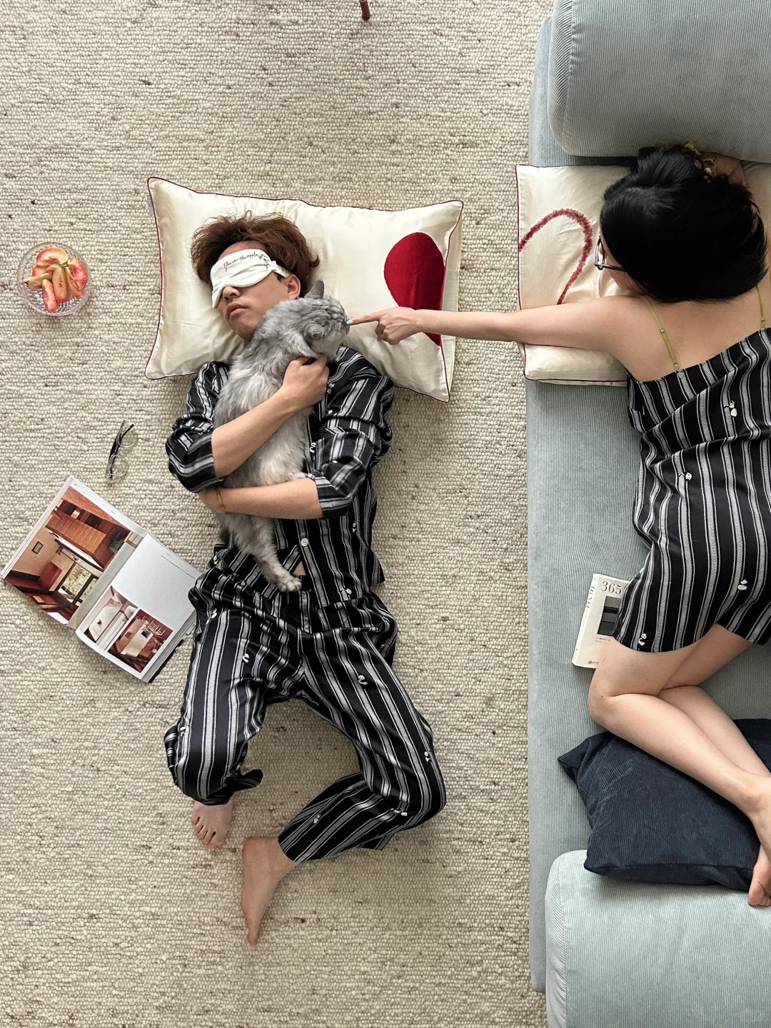- 外面将近快40度的温度 站在不开空调的阳台,都被热浪闷脸 我两个这种没有啥朋友的i人 虽然都30多岁了 但好像都没觉得自己是大人 两个幼稚的人基本就是宅家快乐 一起在这个属于自己的64平小家里 穿着舒适自在的真丝睡衣 肆意地感受属于我们的不慌不忙 真丝的柔滑体感,像夏日里的清凉轻抚 不管干什么,都顺着你的身体一起舒展 - 说实话,生活好了 在很多方面都开始尝试以前不太舍得买的 对于长时间居家的我们来说 一起办公一起看电视一起做饭 一起逗猫一起玩闹一起依偎 都需要轻盈的舒适的状态来承载 -