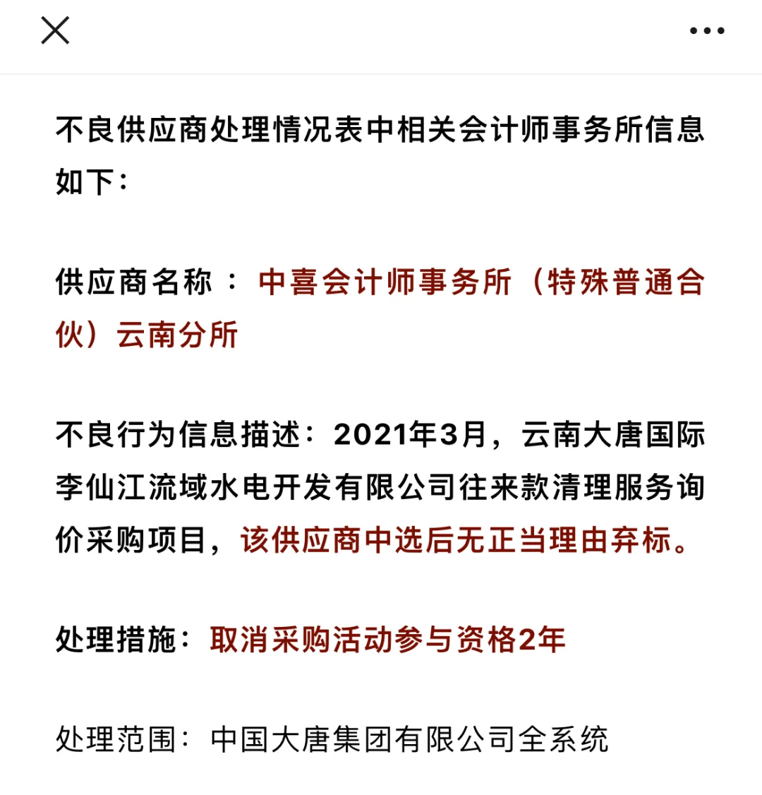 近日,中国大唐集团发布关于供应商不良行为处理情况的公告。小编注意到被处理的供应商名单中,有一家会计师事务所。2021年3月,云南大唐国际李仙江流域水电开发有限公司往来款清理服务询价采购项目,中喜会计师事务所(特殊普通合伙)云南分所中选后无正当理由弃标。大唐集团处决定取消该会计所采购活动参与资格2年。 来源:官方招标平台