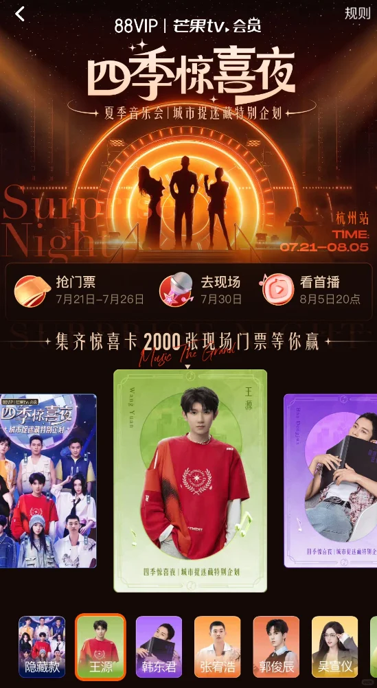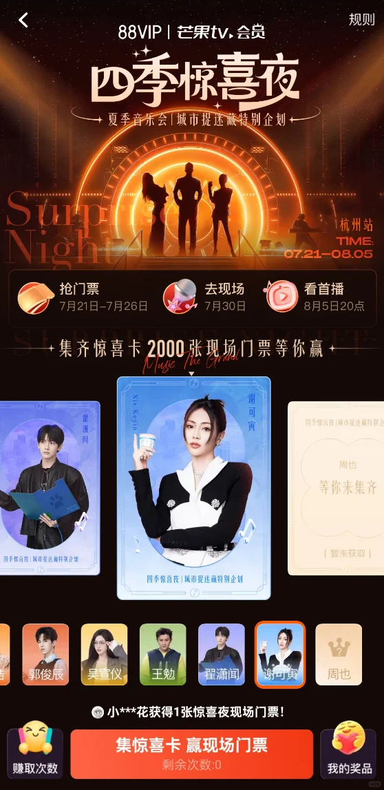 所以刷到88VIP要和《城市捉迷藏》做四季惊喜夜的演唱会,而且还有机会去看!现!场!我立马打开🍑宝参加活动,感兴趣的宝都可以去🔍「四季惊喜夜」,做任务集满10张惊喜卡即可🆓get门票一张!我也还在集卡ing......看了网传版节目单我更期待了,一定要让我抽中!!