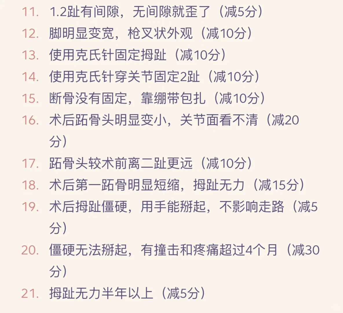 我们最近研究一个拇外翻术后评分方法,医用的一个,患者用的一个。 更重要的是告诉患者哪些问题比较严重,而哪些又不是问题。 比如术后肿胀问题,麻木问题,拇趾上翘问题,籽骨复位问题,拇趾旋转问题等等问题,并没有列到评分里面,说明它不会影响手术的效果,很多属于正常表现或者恢复期表现。 而有些问题非常重要,甚至导致术后翻修。 初步设想,还需要大家补充修改。