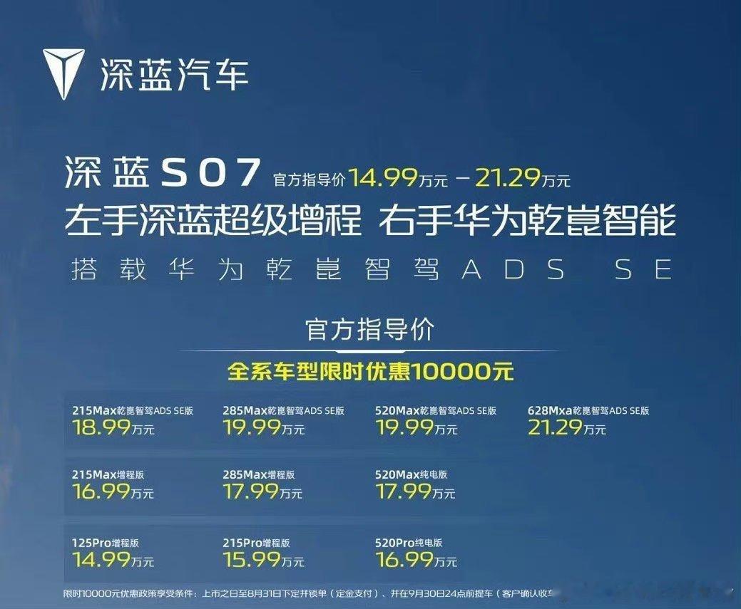 同时全系车型限时优惠1万元,其中215Max增程版、215Max乾崑智驾ADS SE版、215Pro增程版为深蓝S7经典再升级版本