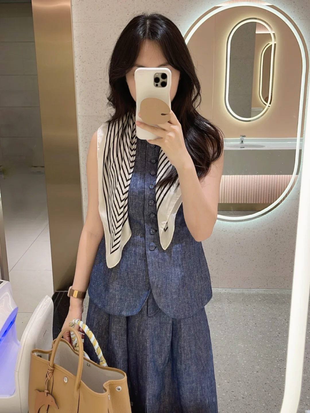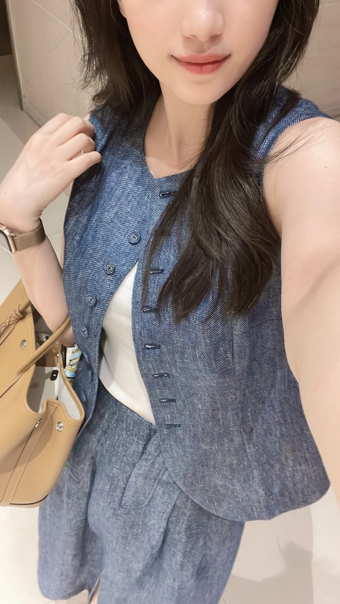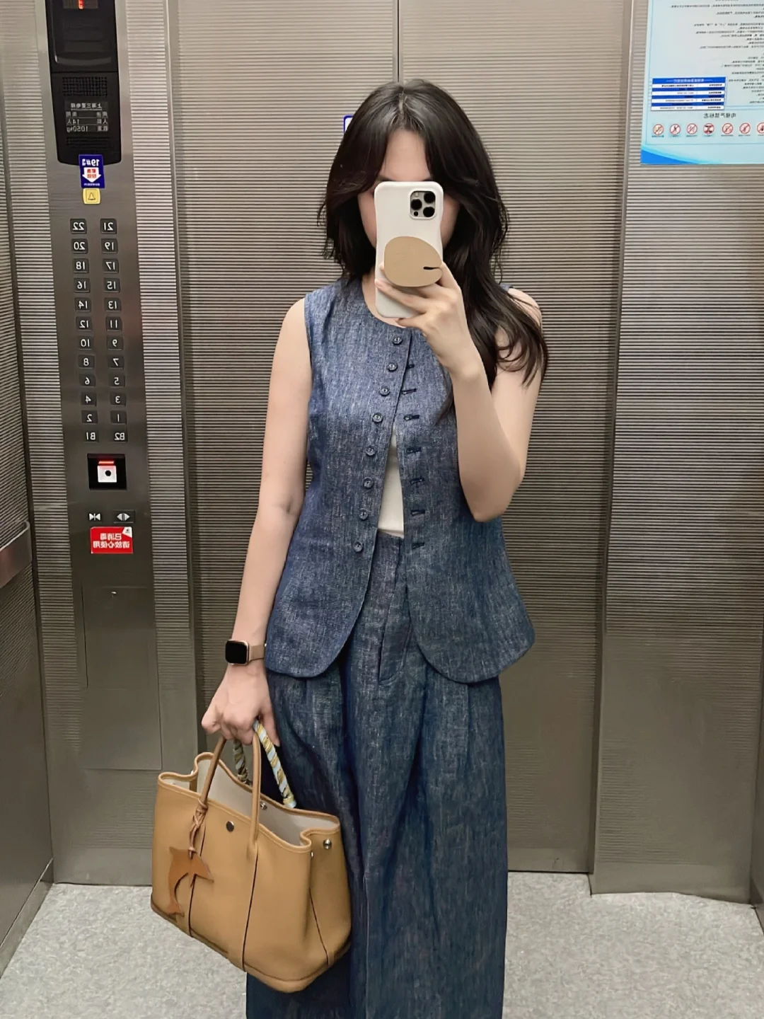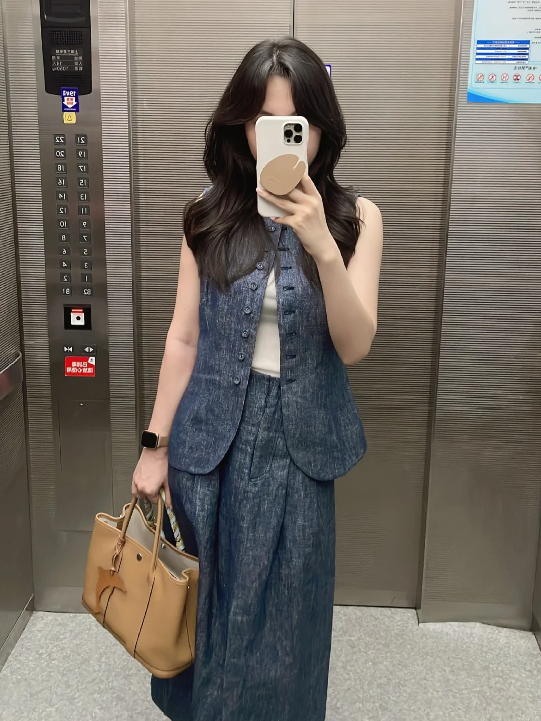 牛仔蓝色➕饼干色搭起来怎么看怎么顺眼,今年好像很流行这种马甲单穿,搭配了个白色背心多了分随意~ 想尝试这种马甲觉得单穿怪怪的,可以搭配一个吊带或者背心,马上觉得真香~ 我向来喜欢修身款一点,喜欢松弛感的可以大一码~