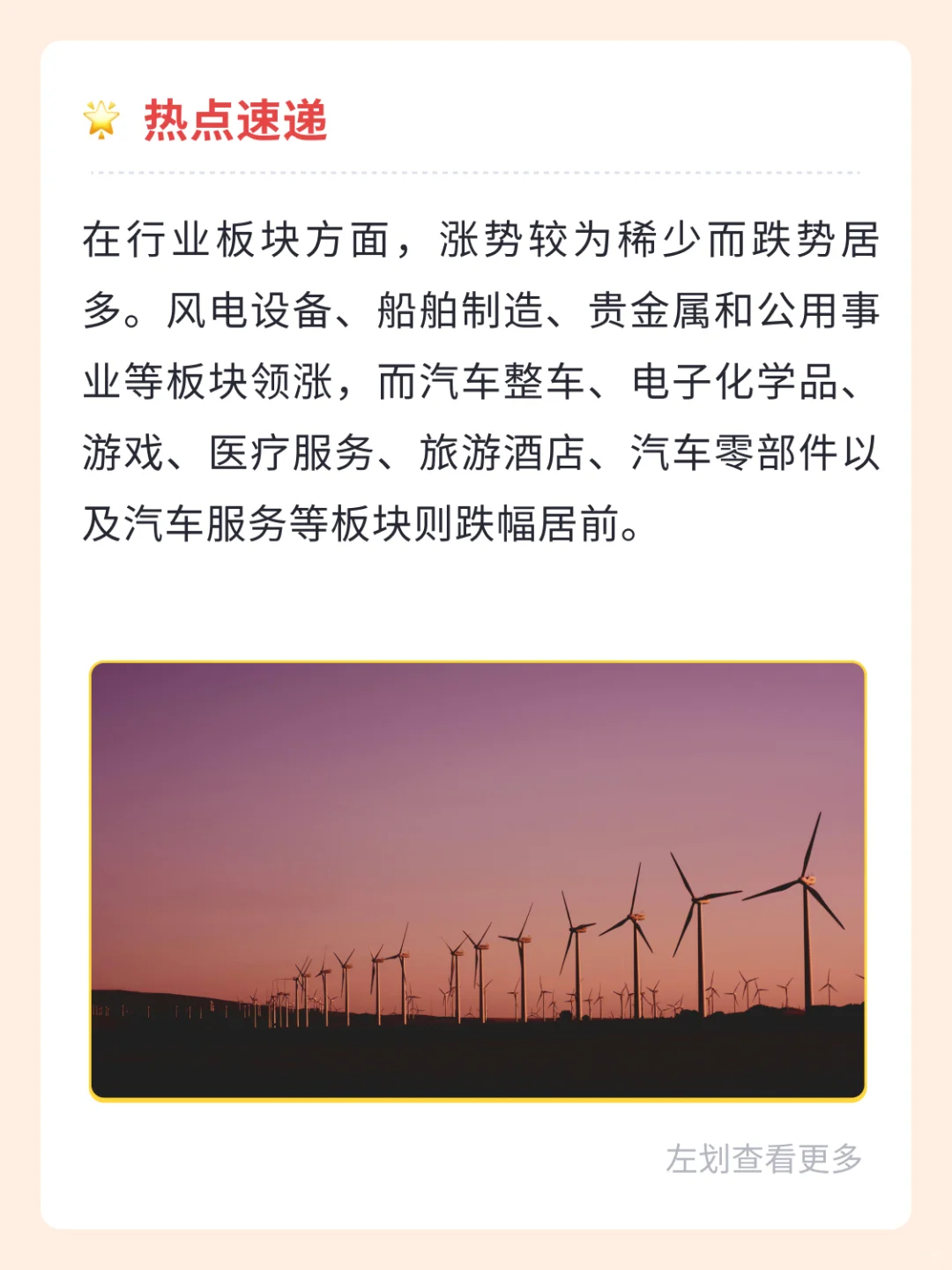 👉 在行业板块方面,涨势较为稀少而跌势居多。风电设备、船舶制造、贵金属和公用事业等板块领涨,而汽车整车、电子化学品、游戏、医疗服务、旅游酒店、汽车零部件以及汽车服务等板块则跌幅居前。