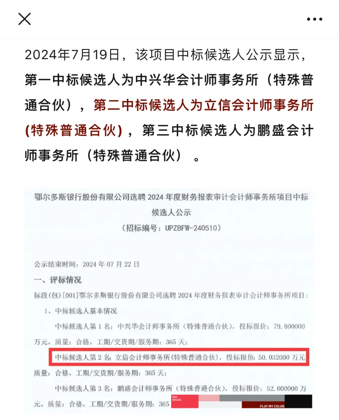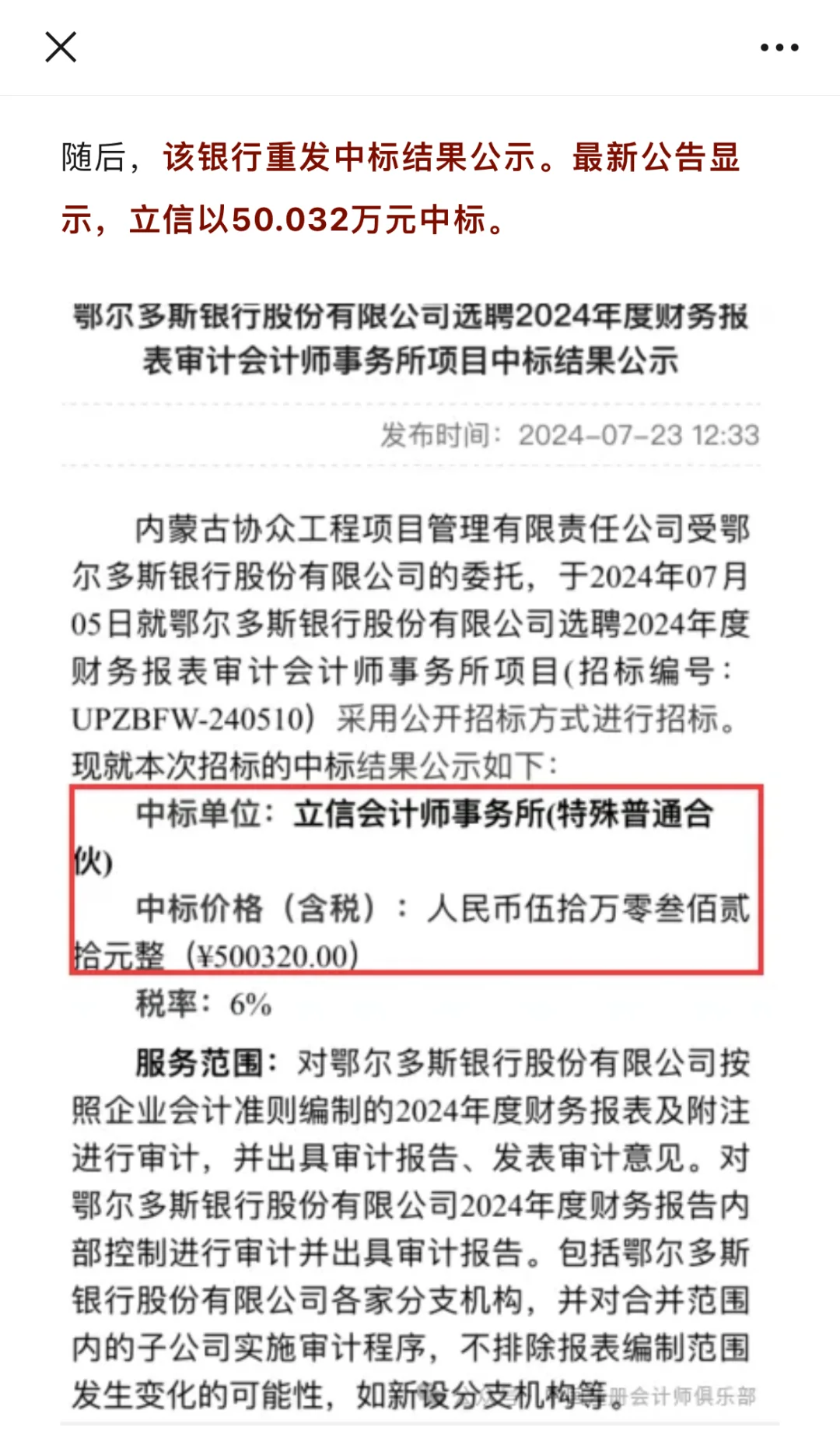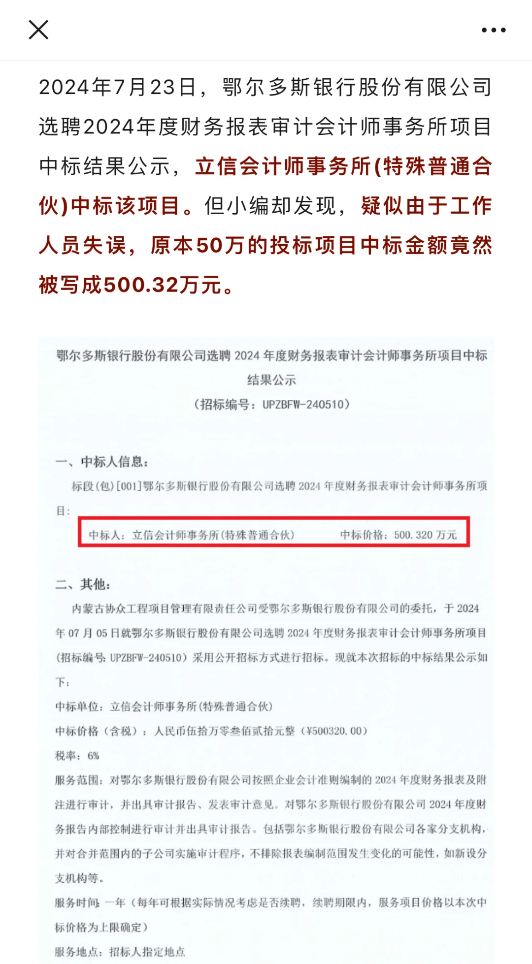 2024年7月23日,鄂尔多斯银行股份有限公司选聘2024年度财务报表审计会计师事务所项目中标结果公示,立信会计师事务所(特殊普通合伙)中标该项目。但小编却发现,疑似由于工作人员失误,原本50万的投标项目中标金额竟然被写成500.32万元。随后,该银行重发中标结果公示。最新公告显示,立信以50.032万元中标。