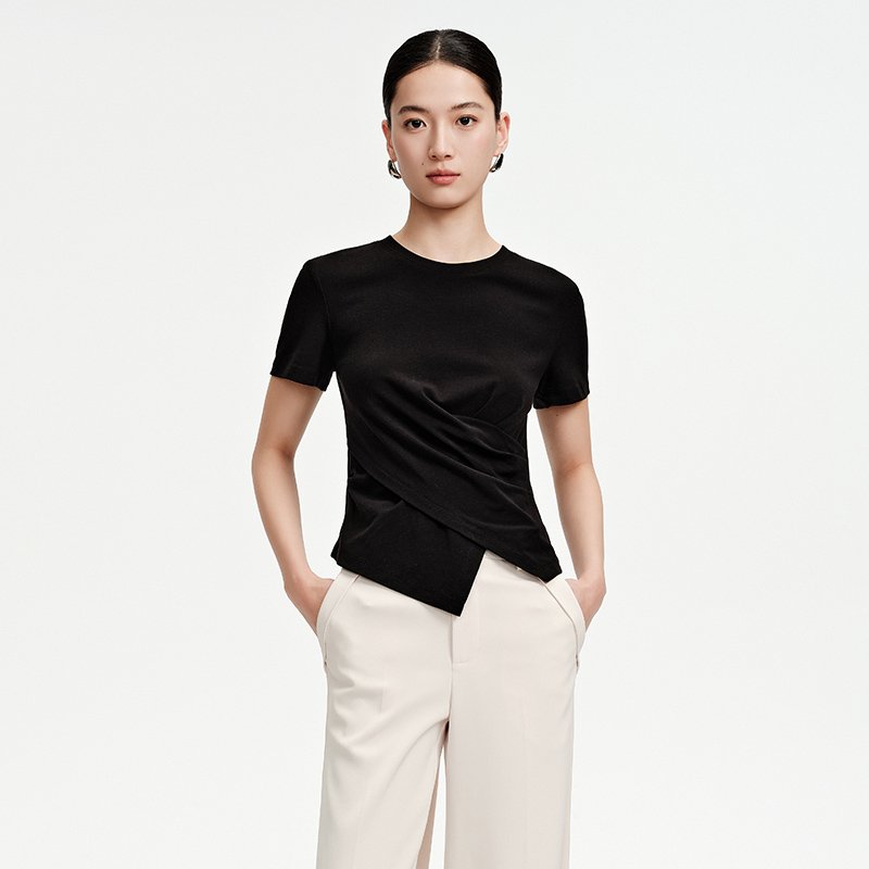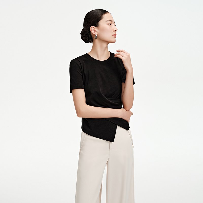 纯色T恤是时髦精春夏穿搭YYDS,时髦交叉收腰设计,打造迷人小蛮腰,打破T恤平淡的刻板印象,比普通基础款更具气质,轻松解锁INS同款街拍造型,优雅时髦。不对称下摆自然垂顺,隐藏小肚腩,简约随性。