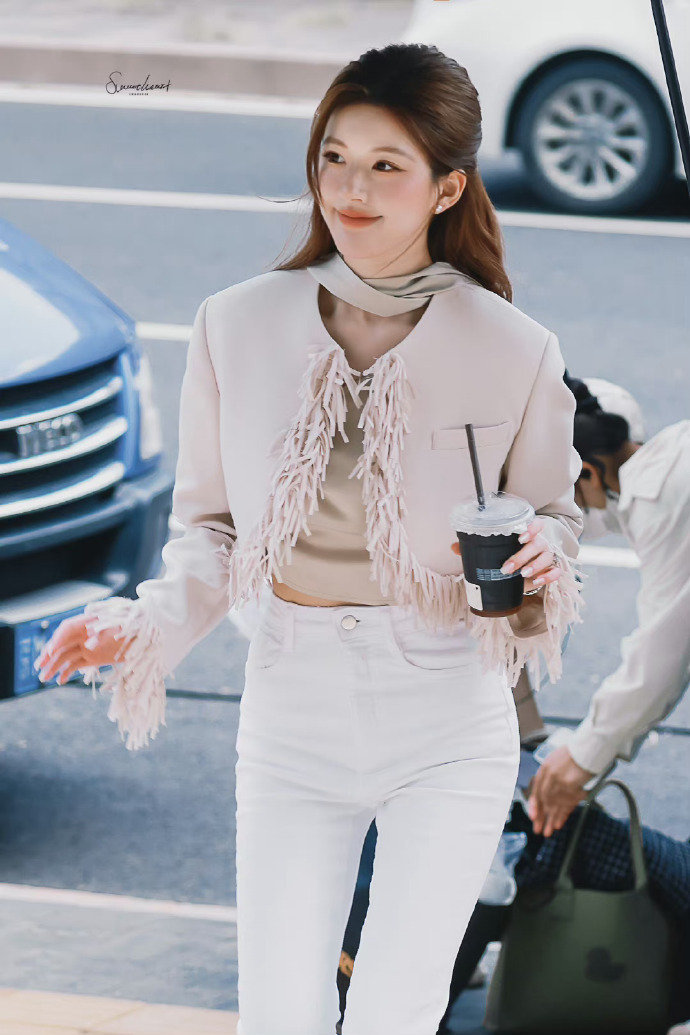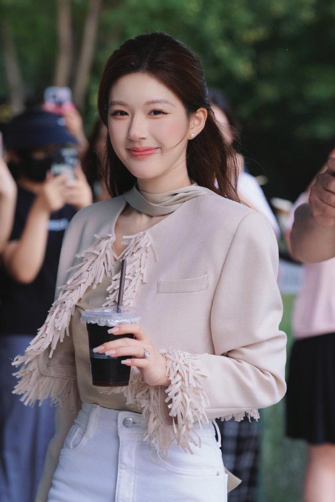 许妍流苏西装外套+白裤子+尖头高跟鞋好有职场感!