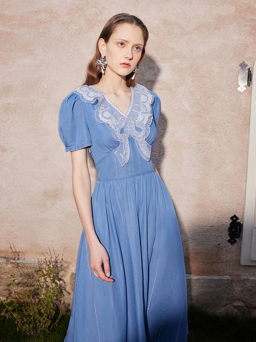 收腰蕾丝娃娃领法式连衣裙