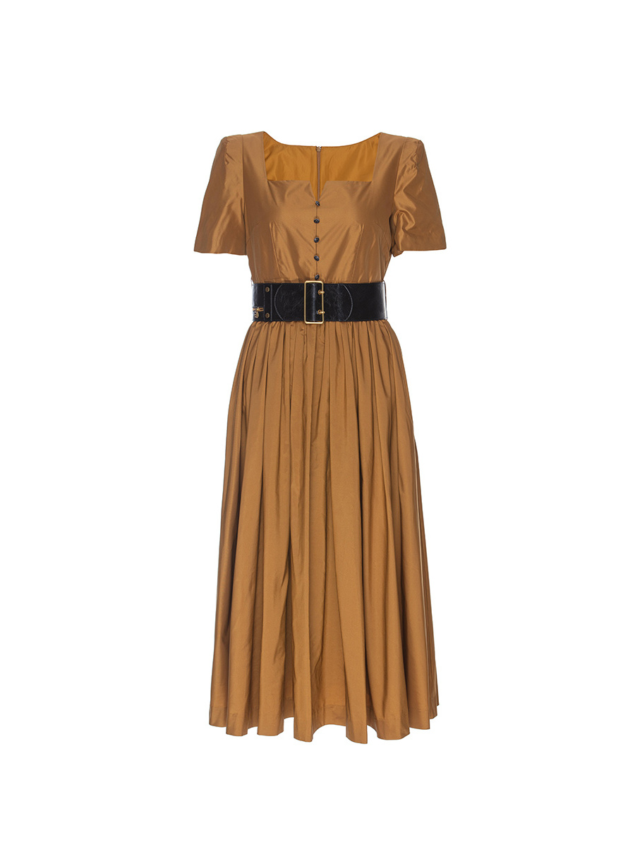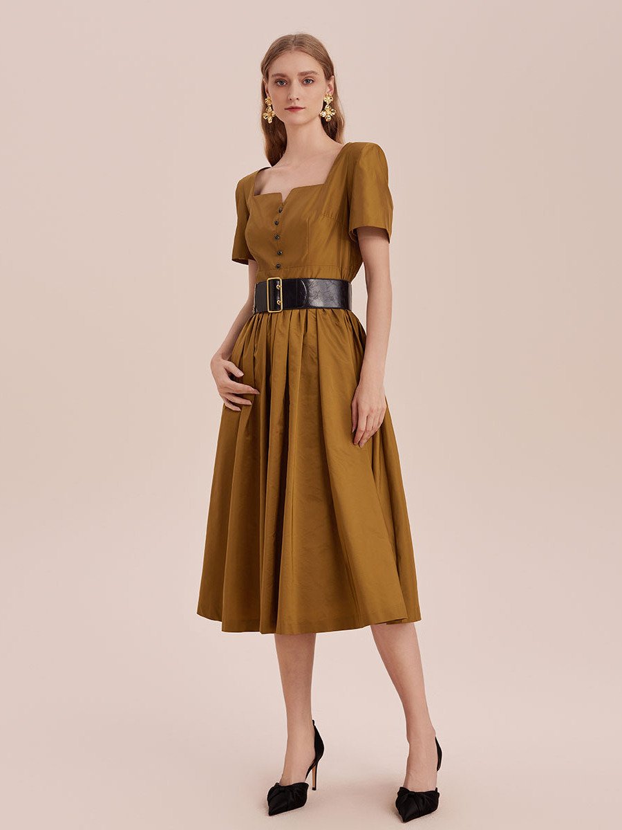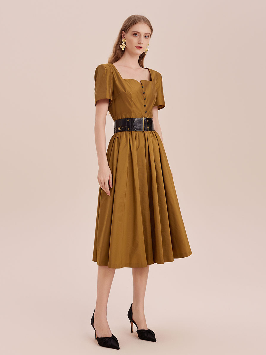 复古方领收腰风衣料压褶短袖连衣裙