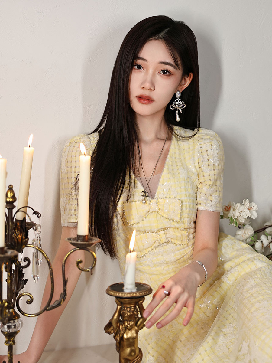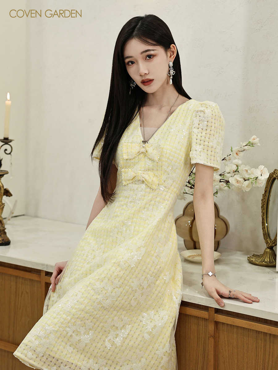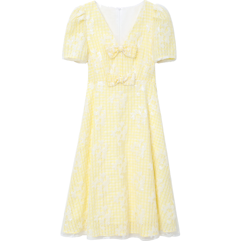 淡黄色清新甜美;满幅珠片绣波光粼粼,仙气灵动;蝴蝶结点缀精致优雅