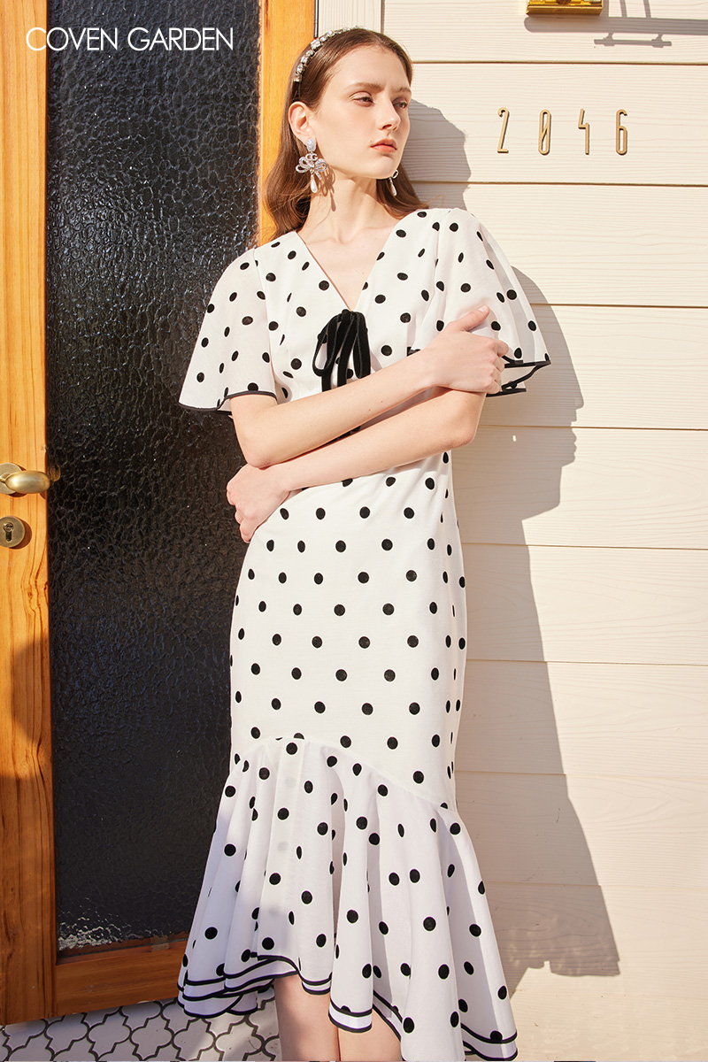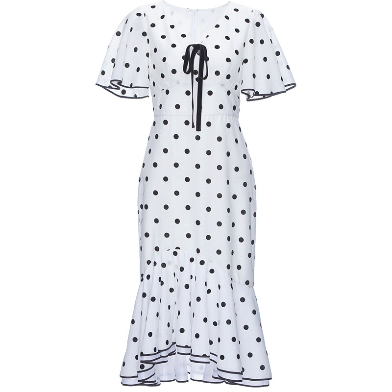 荷叶袖法式复古波点鱼尾连衣裙短袖