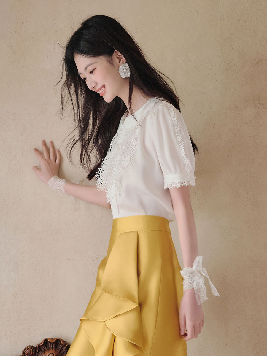 复古泡泡短袖上衣蕾丝娃娃领白衬衫