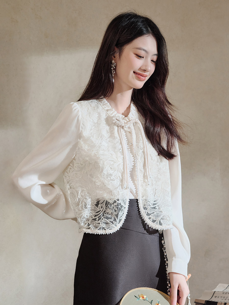 新国风刺绣长袖白衬衫女钉珠网纱
