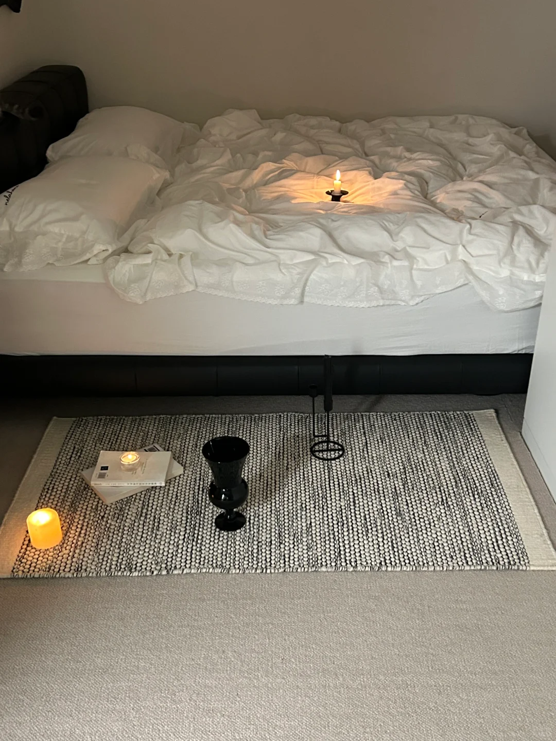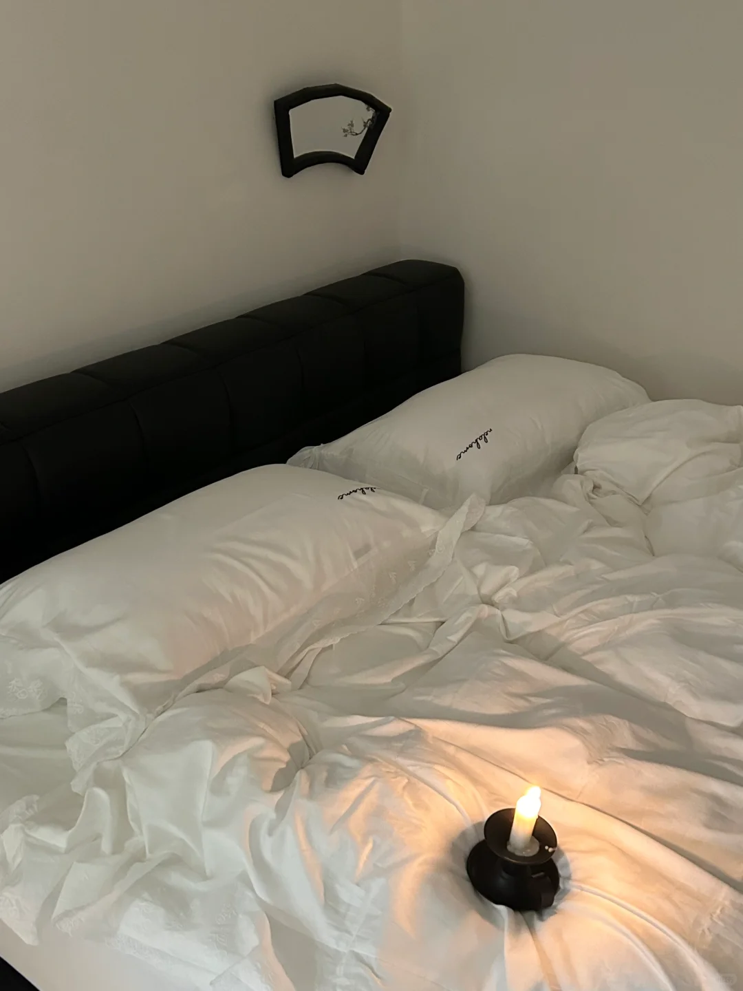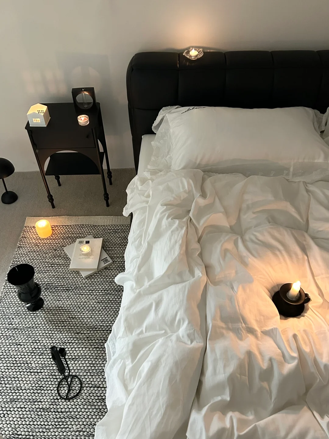 真的很喜欢这种简简单单的布置 不用太复杂的床头背景墙 软装黑白色搭配在一起真的不会单调 反而有点自由浪漫 整个卧室不管是床边毯和灯具以及四件套的元素都很喜欢