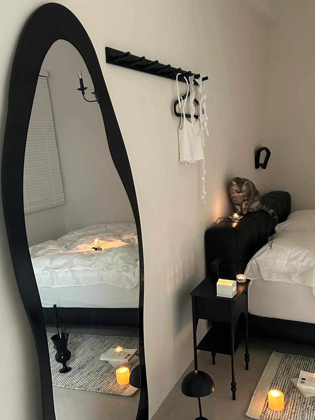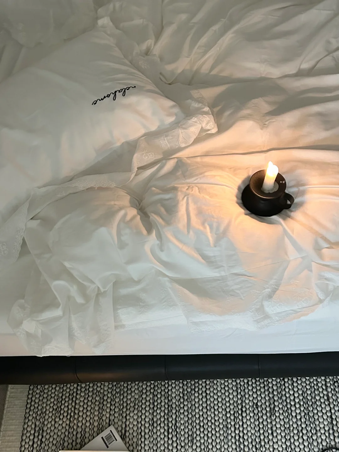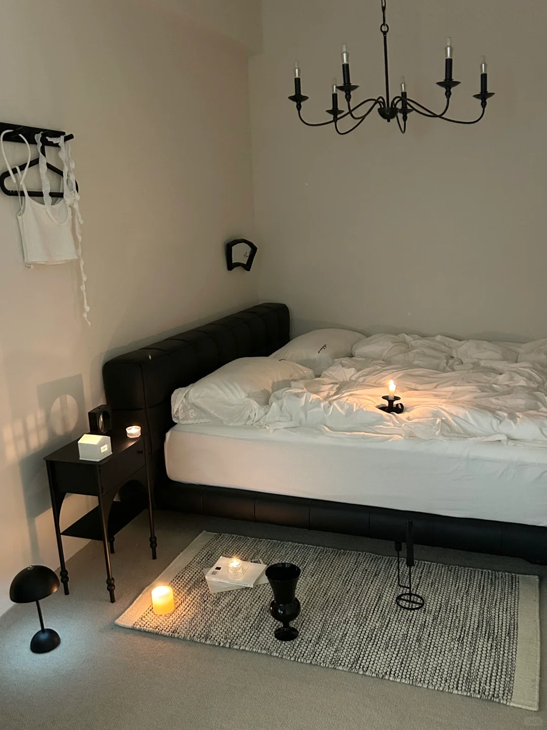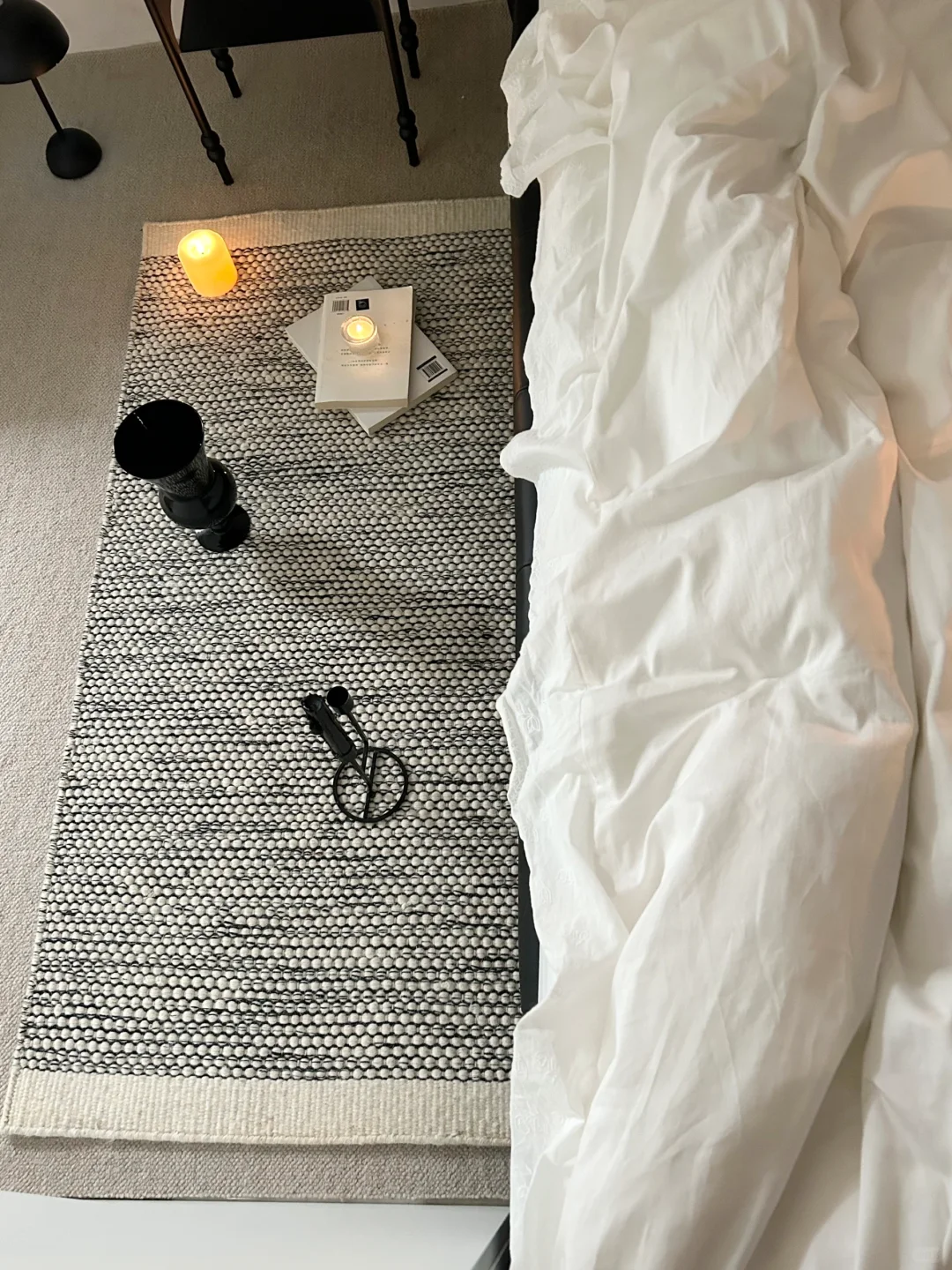 真的很喜欢这种简简单单的布置 不用太复杂的床头背景墙 软装黑白色搭配在一起真的不会单调 反而有点自由浪漫 整个卧室不管是床边毯和灯具以及四件套的元素都很喜欢