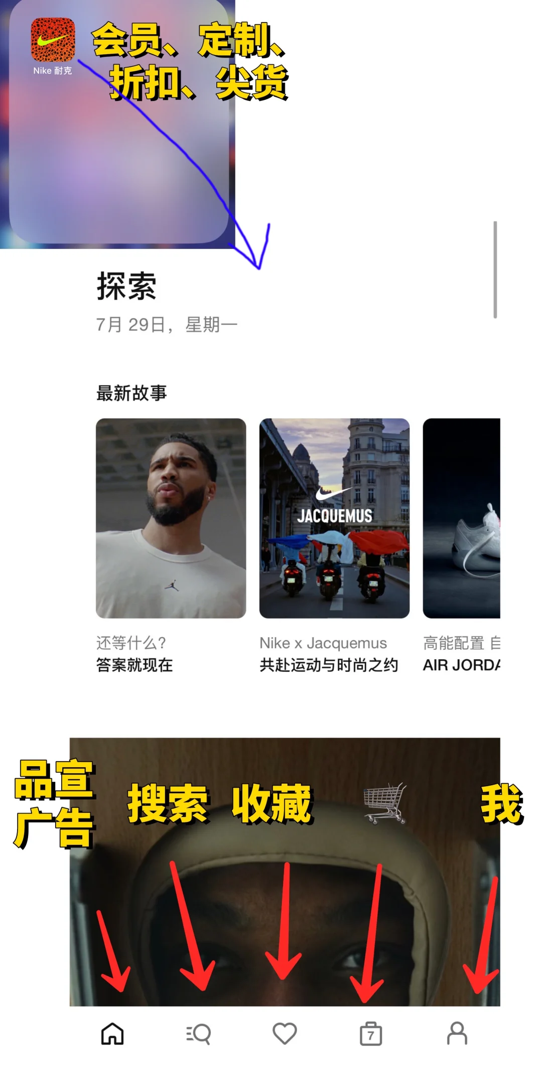 我主要用的Nike app功能有5 个:品宣广告、会员活动、定制运动鞋、折扣、新品日历。